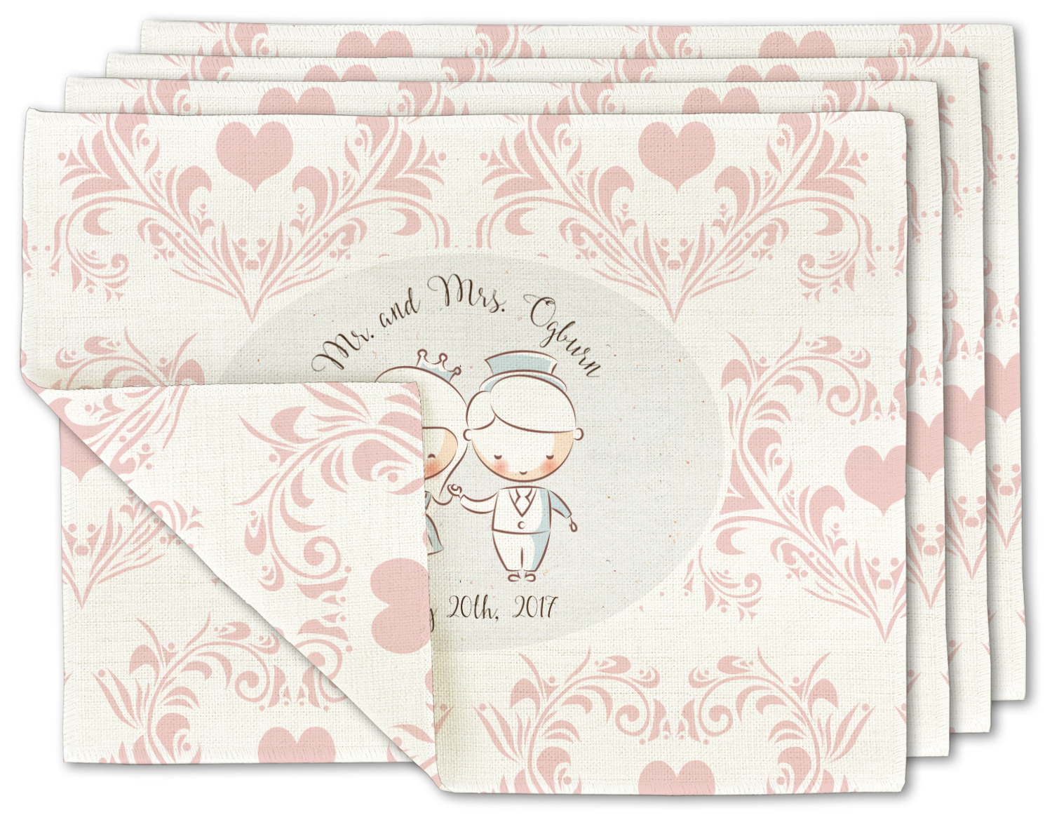 This design has an adorable bride and groom at the center of attention. They sit holding hands on a speckle textured off-white background. Above and below them is where the personalization goes, with the bride and groom's names and wedding date or whatever you choose. The textured background is a circle that surrounds the bride and groom while another background sits behind this circle. The secondary background is a white and light pink heart damask pattern, which looks adorable with the couples and their sweet rosy cheeks.