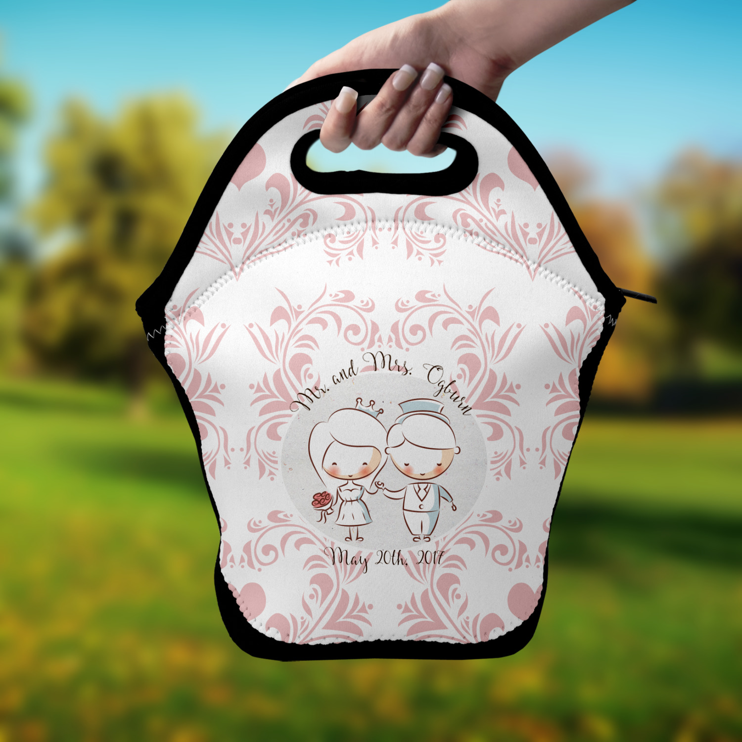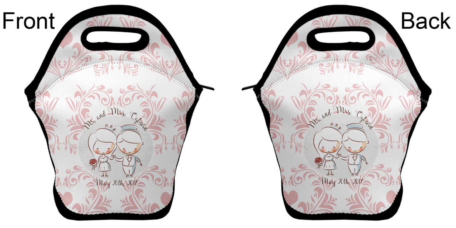 Our personalized lunch bags are made from a strong neoprene, and secure with a zipper closure that lines the top of the bag.The edges of the neoprene are sewn together with a heavy duty stitch, adding to the durability of the bag. The is accompanied by a reinforced handle at its top, for the easy transport of your lunch. We display your personalization across both the front and back of this neoprene lunch bag, while the remaining sides are a sleek black in color. Each bag measures at 13.5 inches tall, and 11.5 inches wide.