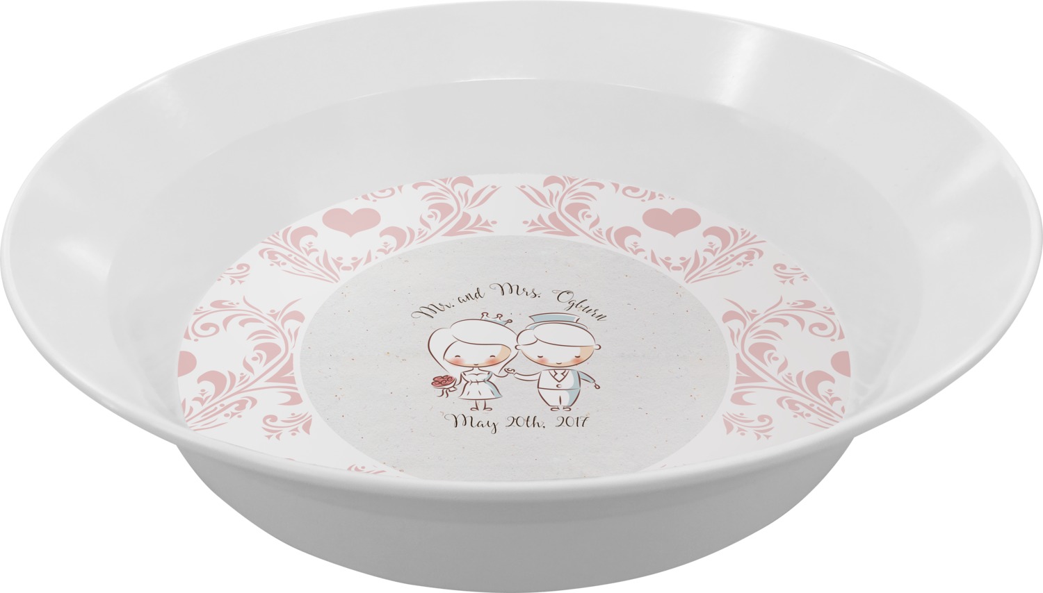 This design has an adorable bride and groom at the center of attention. They sit holding hands on a speckle textured off-white background. Above and below them is where the personalization goes, with the bride and groom's names and wedding date or whatever you choose. The textured background is a circle that surrounds the bride and groom while another background sits behind this circle. The secondary background is a white and light pink heart damask pattern, which looks adorable with the couples and their sweet rosy cheeks.