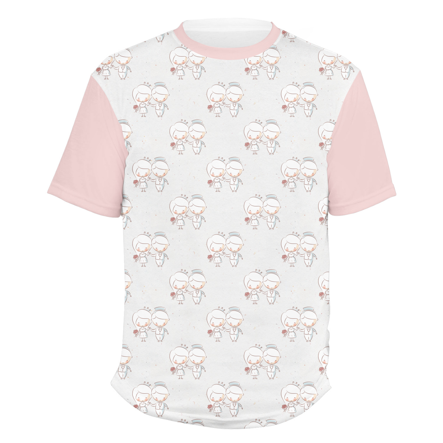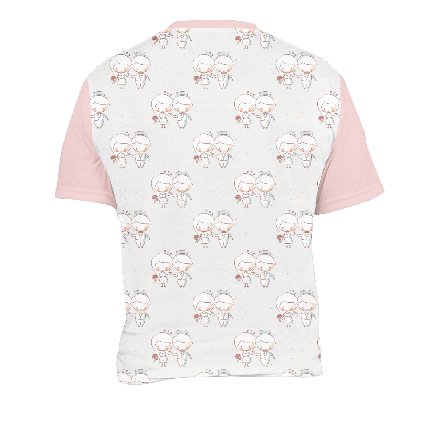 This design has an adorable bride and groom at the center of attention. They sit holding hands on a speckle textured off-white background. Above and below them is where the personalization goes, with the bride and groom's names and wedding date or whatever you choose. The textured background is a circle that surrounds the bride and groom while another background sits behind this circle. The secondary background is a white and light pink heart damask pattern, which looks adorable with the couples and their sweet rosy cheeks.