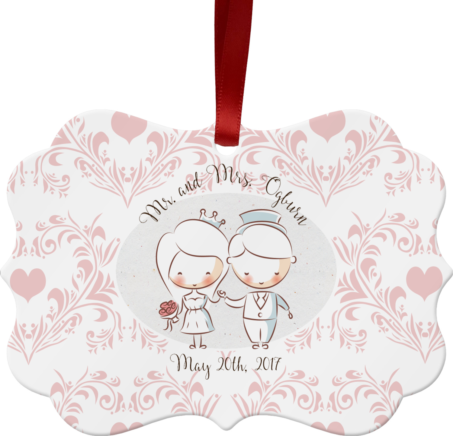 This design has an adorable bride and groom at the center of attention. They sit holding hands on a speckle textured off-white background. Above and below them is where the personalization goes, with the bride and groom's names and wedding date or whatever you choose. The textured background is a circle that surrounds the bride and groom while another background sits behind this circle. The secondary background is a white and light pink heart damask pattern, which looks adorable with the couples and their sweet rosy cheeks.