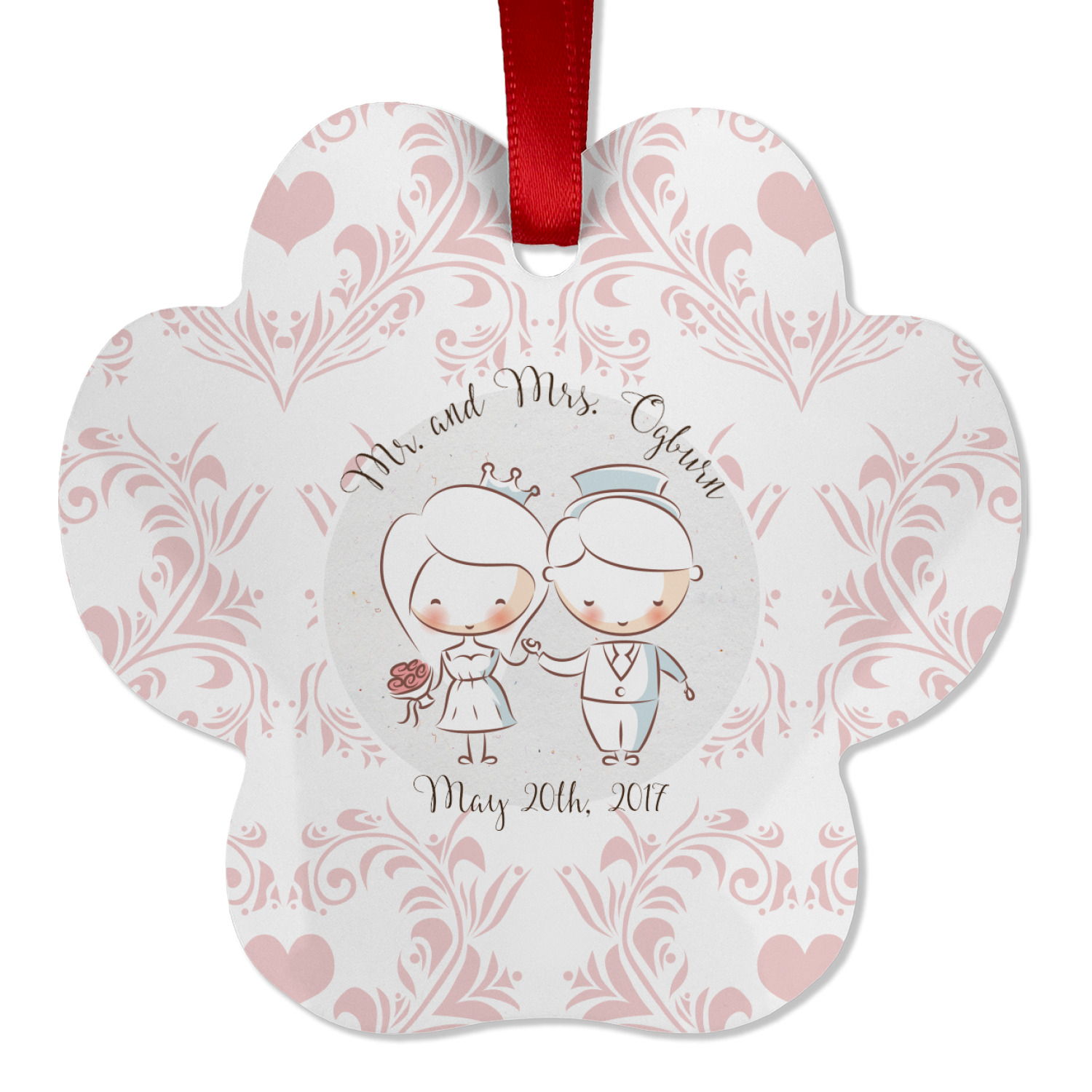 This design has an adorable bride and groom at the center of attention. They sit holding hands on a speckle textured off-white background. Above and below them is where the personalization goes, with the bride and groom's names and wedding date or whatever you choose. The textured background is a circle that surrounds the bride and groom while another background sits behind this circle. The secondary background is a white and light pink heart damask pattern, which looks adorable with the couples and their sweet rosy cheeks.