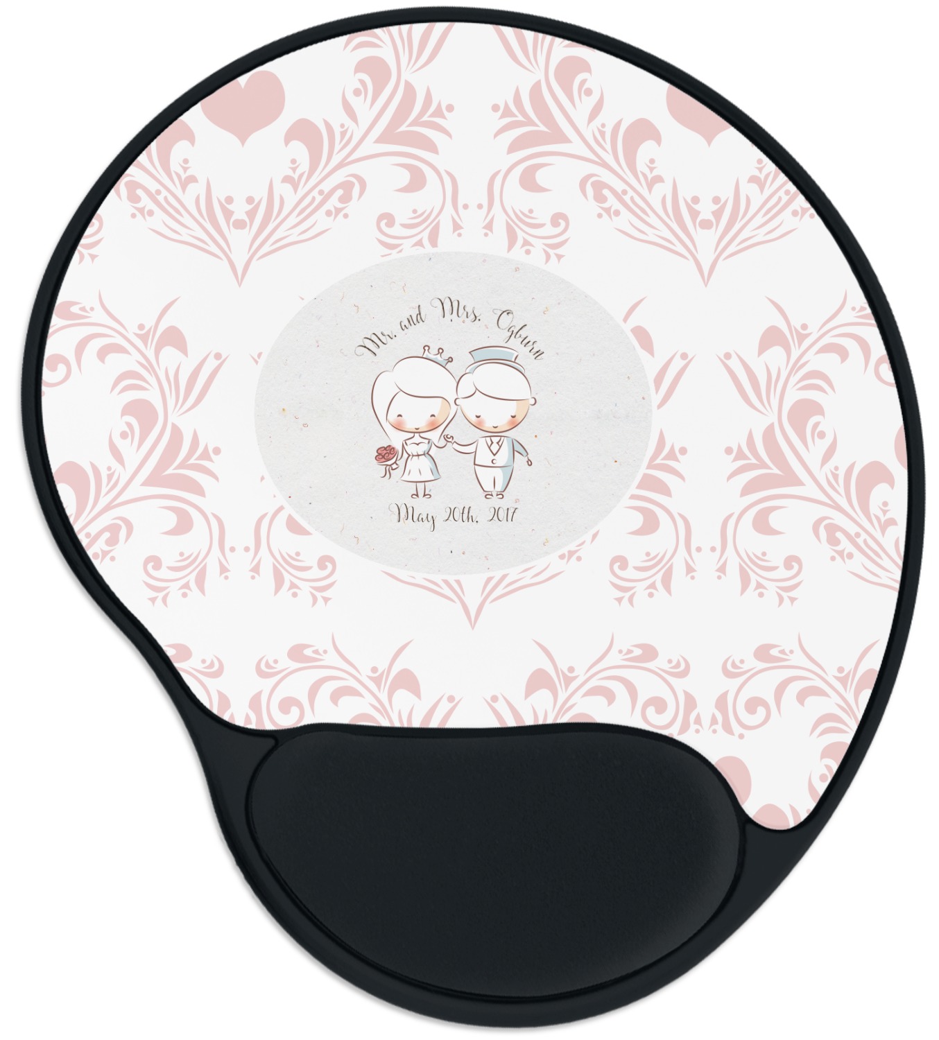 This design has an adorable bride and groom at the center of attention. They sit holding hands on a speckle textured off-white background. Above and below them is where the personalization goes, with the bride and groom's names and wedding date or whatever you choose. The textured background is a circle that surrounds the bride and groom while another background sits behind this circle. The secondary background is a white and light pink heart damask pattern, which looks adorable with the couples and their sweet rosy cheeks.