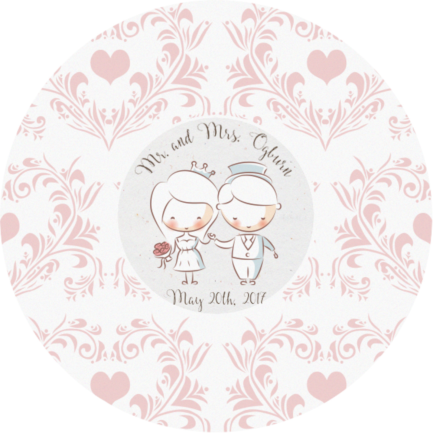 This design has an adorable bride and groom at the center of attention. They sit holding hands on a speckle textured off-white background. Above and below them is where the personalization goes, with the bride and groom's names and wedding date or whatever you choose. The textured background is a circle that surrounds the bride and groom while another background sits behind this circle. The secondary background is a white and light pink heart damask pattern, which looks adorable with the couples and their sweet rosy cheeks.