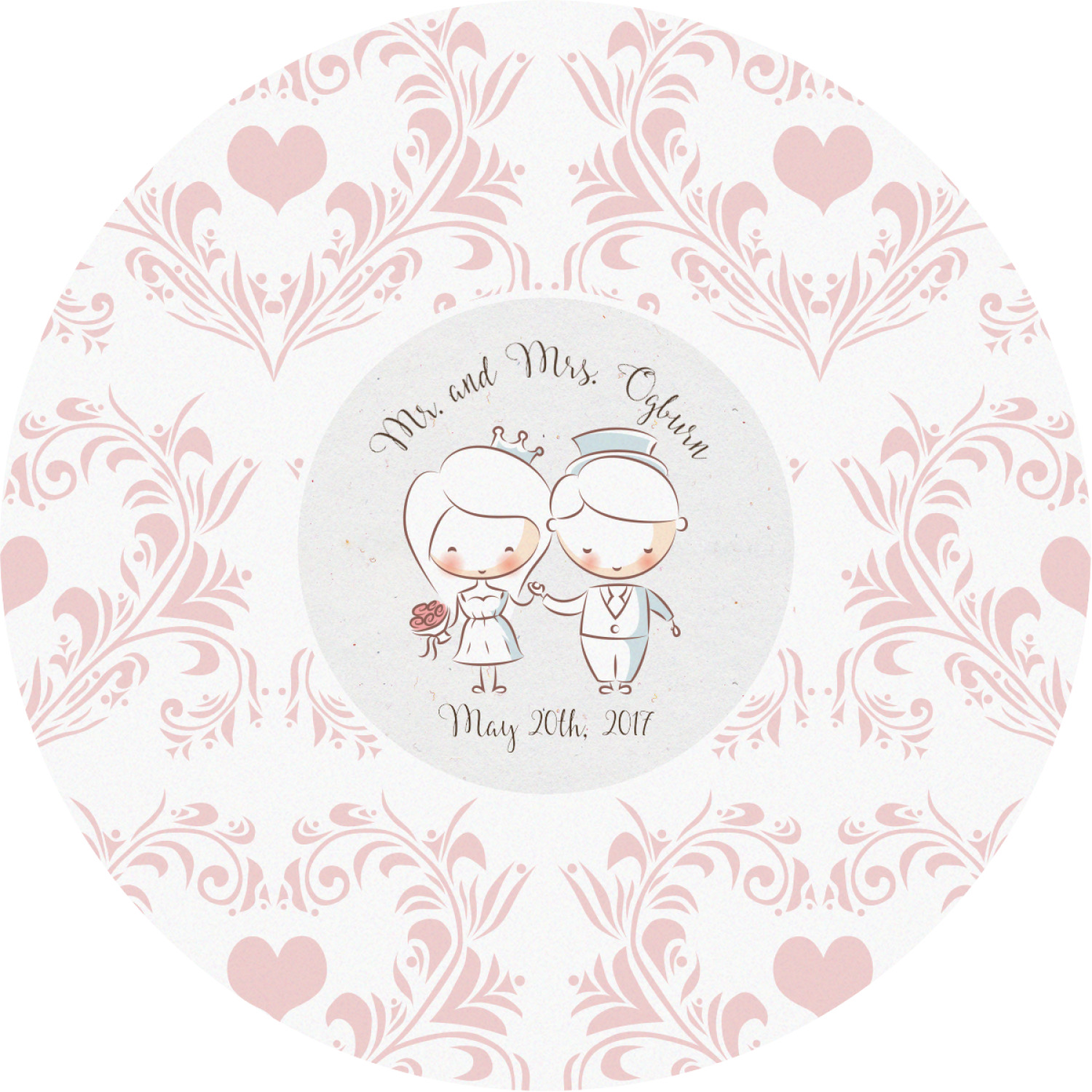 This design has an adorable bride and groom at the center of attention. They sit holding hands on a speckle textured off-white background. Above and below them is where the personalization goes, with the bride and groom's names and wedding date or whatever you choose. The textured background is a circle that surrounds the bride and groom while another background sits behind this circle. The secondary background is a white and light pink heart damask pattern, which looks adorable with the couples and their sweet rosy cheeks.