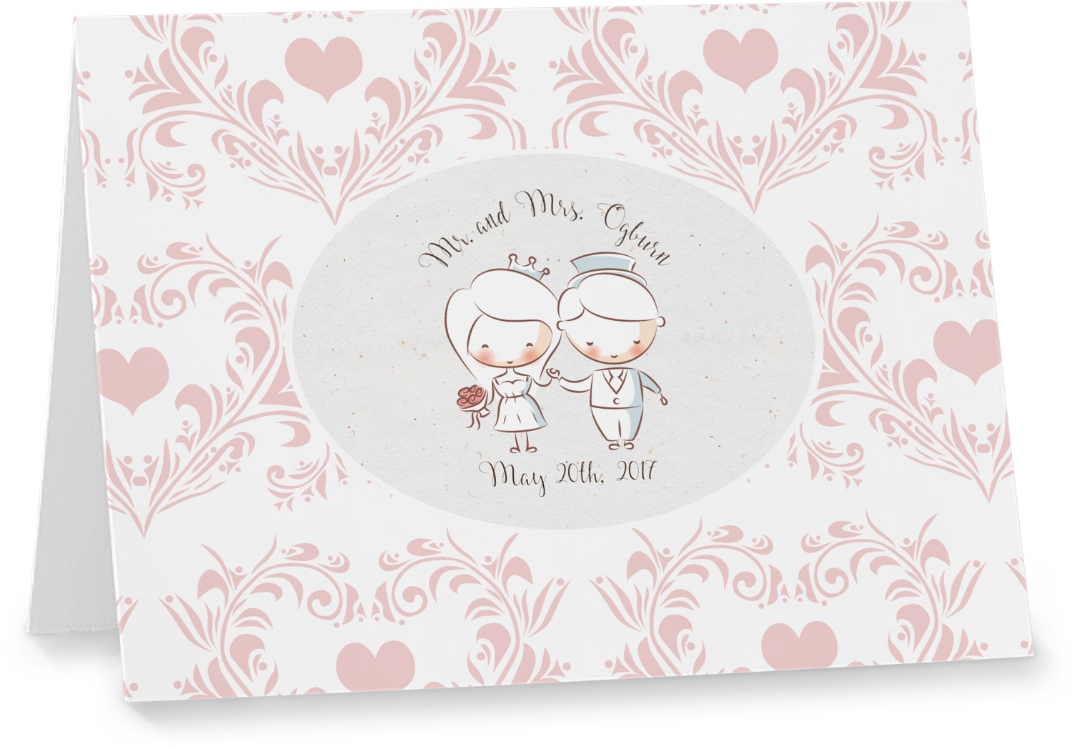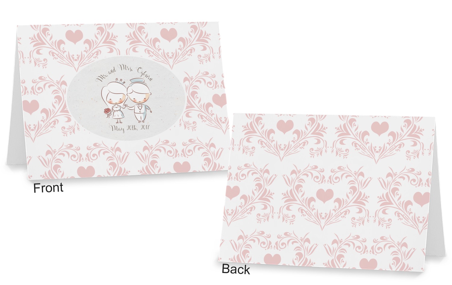 This design has an adorable bride and groom at the center of attention. They sit holding hands on a speckle textured off-white background. Above and below them is where the personalization goes, with the bride and groom's names and wedding date or whatever you choose. The textured background is a circle that surrounds the bride and groom while another background sits behind this circle. The secondary background is a white and light pink heart damask pattern, which looks adorable with the couples and their sweet rosy cheeks.