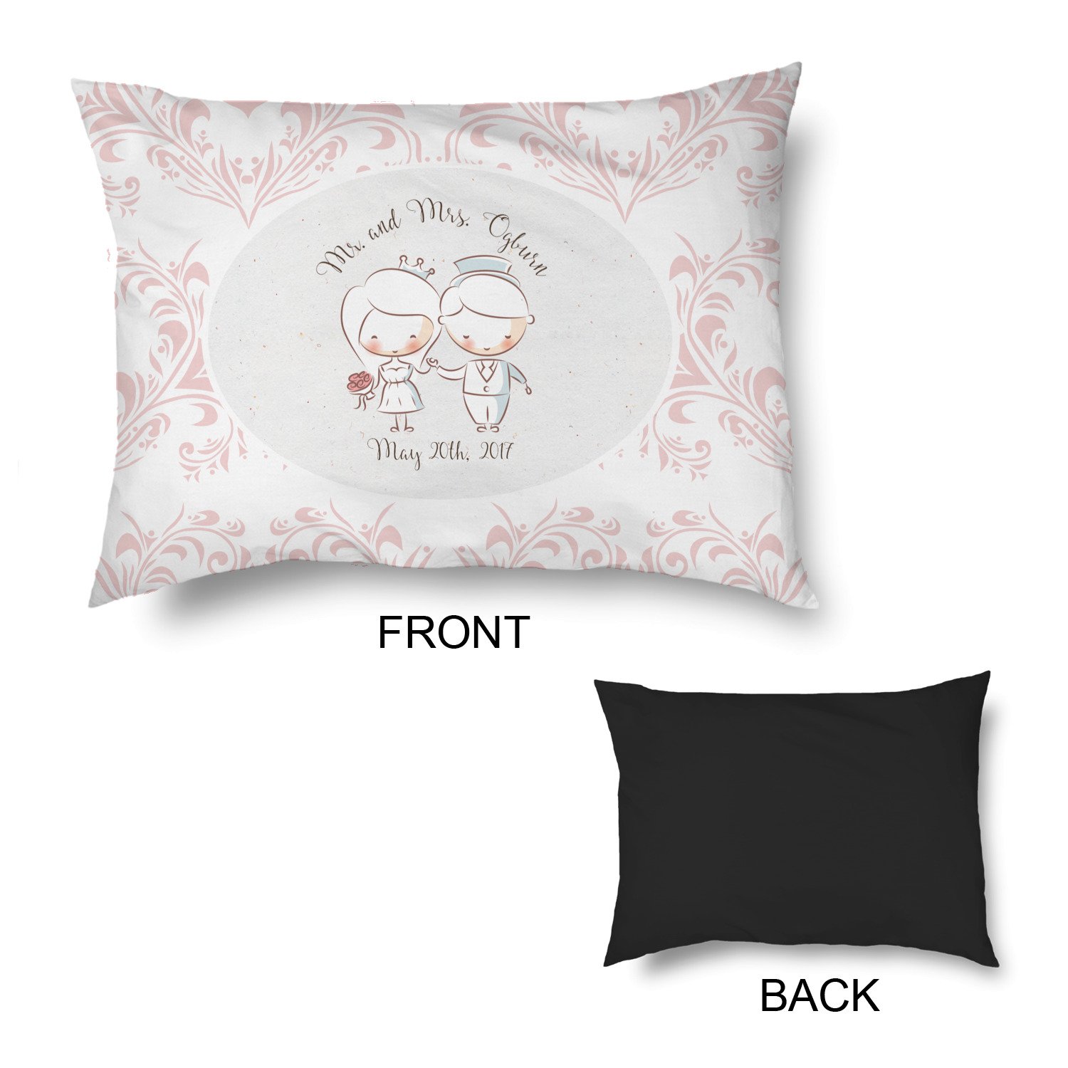 This design has an adorable bride and groom at the center of attention. They sit holding hands on a speckle textured off-white background. Above and below them is where the personalization goes, with the bride and groom's names and wedding date or whatever you choose. The textured background is a circle that surrounds the bride and groom while another background sits behind this circle. The secondary background is a white and light pink heart damask pattern, which looks adorable with the couples and their sweet rosy cheeks.