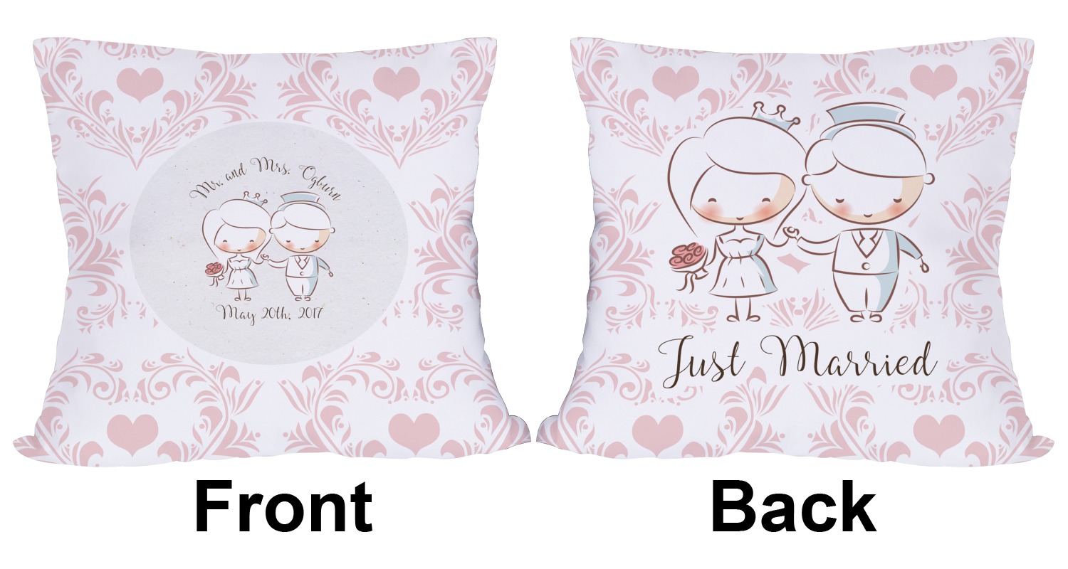 This design has an adorable bride and groom at the center of attention. They sit holding hands on a speckle textured off-white background. Above and below them is where the personalization goes, with the bride and groom's names and wedding date or whatever you choose. The textured background is a circle that surrounds the bride and groom while another background sits behind this circle. The secondary background is a white and light pink heart damask pattern, which looks adorable with the couples and their sweet rosy cheeks.