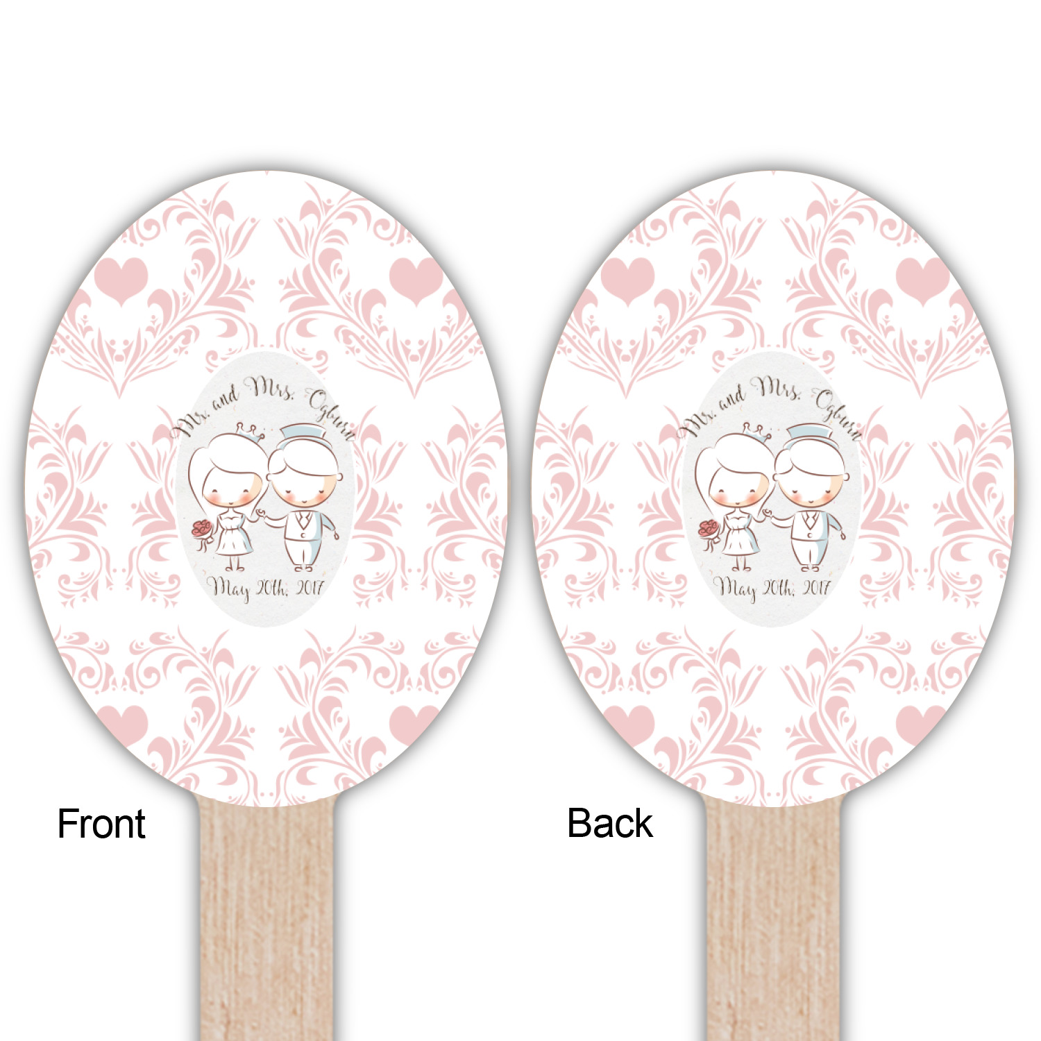 This design has an adorable bride and groom at the center of attention. They sit holding hands on a speckle textured off-white background. Above and below them is where the personalization goes, with the bride and groom's names and wedding date or whatever you choose. The textured background is a circle that surrounds the bride and groom while another background sits behind this circle. The secondary background is a white and light pink heart damask pattern, which looks adorable with the couples and their sweet rosy cheeks.