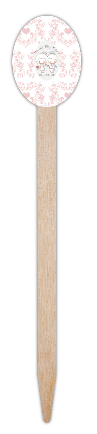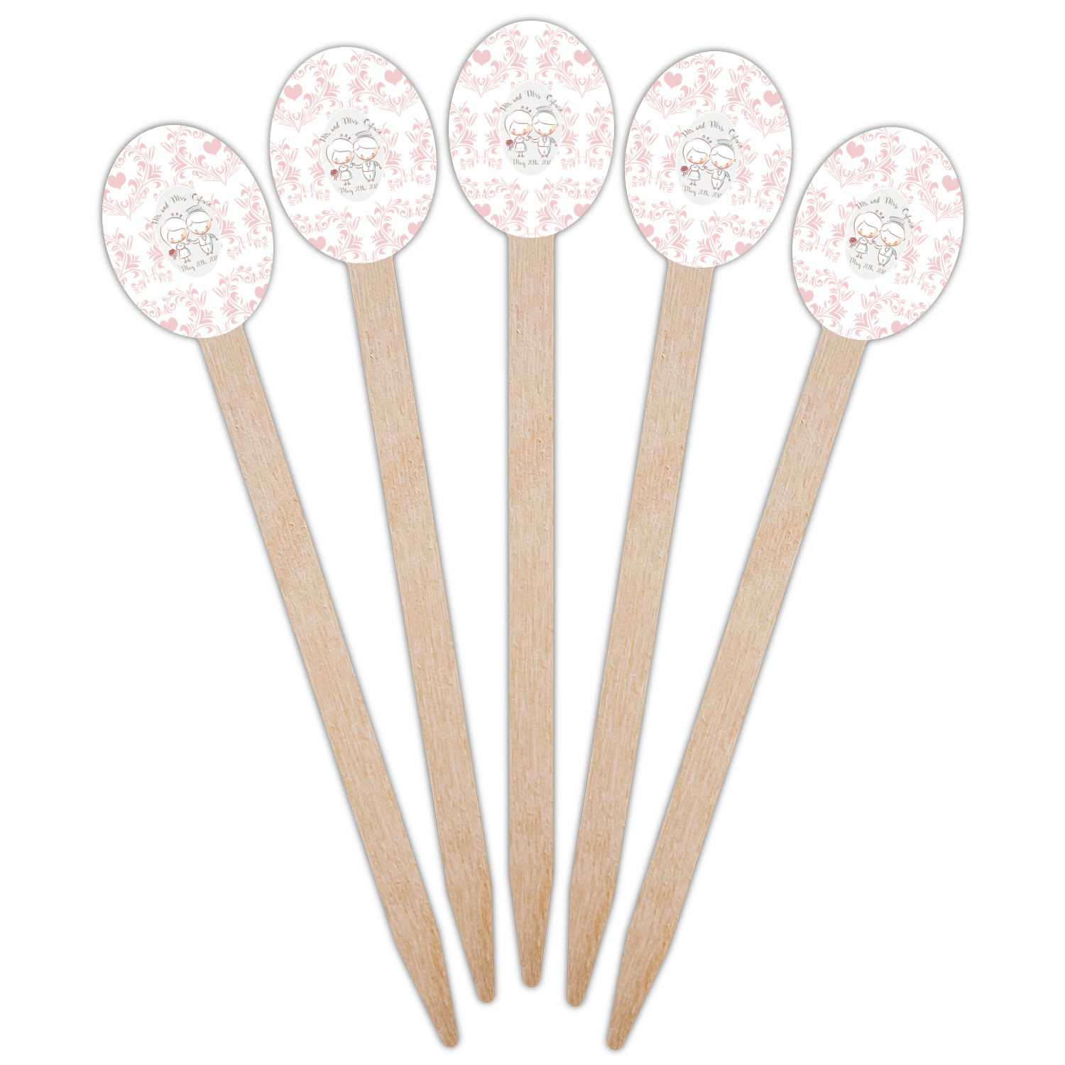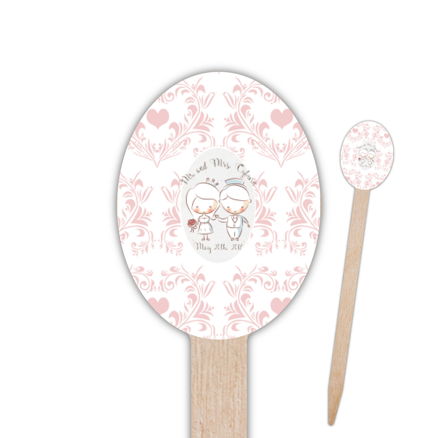 This design has an adorable bride and groom at the center of attention. They sit holding hands on a speckle textured off-white background. Above and below them is where the personalization goes, with the bride and groom's names and wedding date or whatever you choose. The textured background is a circle that surrounds the bride and groom while another background sits behind this circle. The secondary background is a white and light pink heart damask pattern, which looks adorable with the couples and their sweet rosy cheeks.