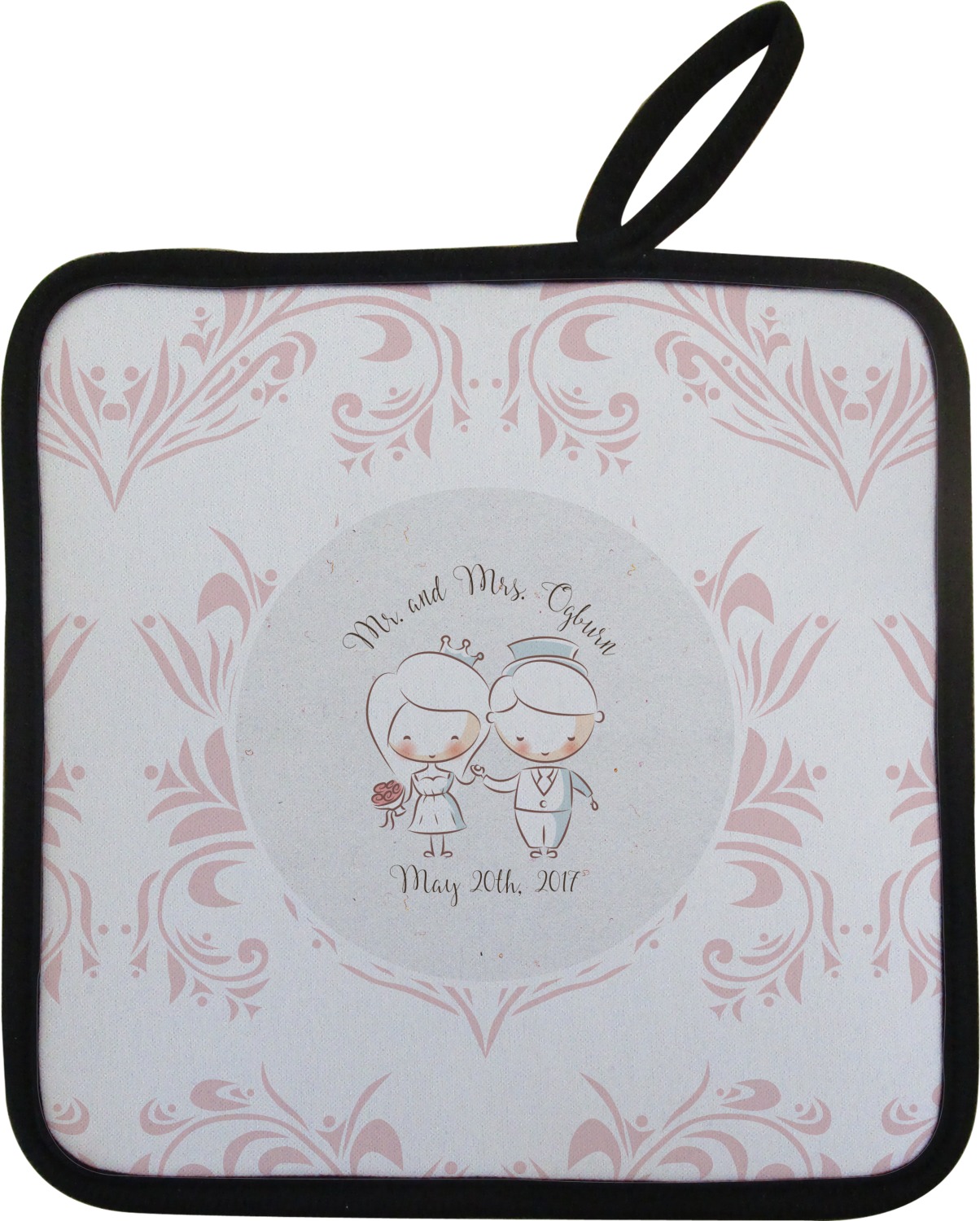 Along with our heat resistant gloves, we also carry personalized pot holders. These pot holders also feature a neoprene front that displays your personalization, and a textured, rubber backing for a sturdy grip. The two materials are connected with a sleek, black trim, and the hot pot holder also includes an attached loop for hanging and storage. You can purchase a kitchen pot holder by itself, or alongside a right or left oven mitt, depending on your needs. The pot holder itself is approximately 8.75 inches by 8.75 inches and 0.25 inches tall.