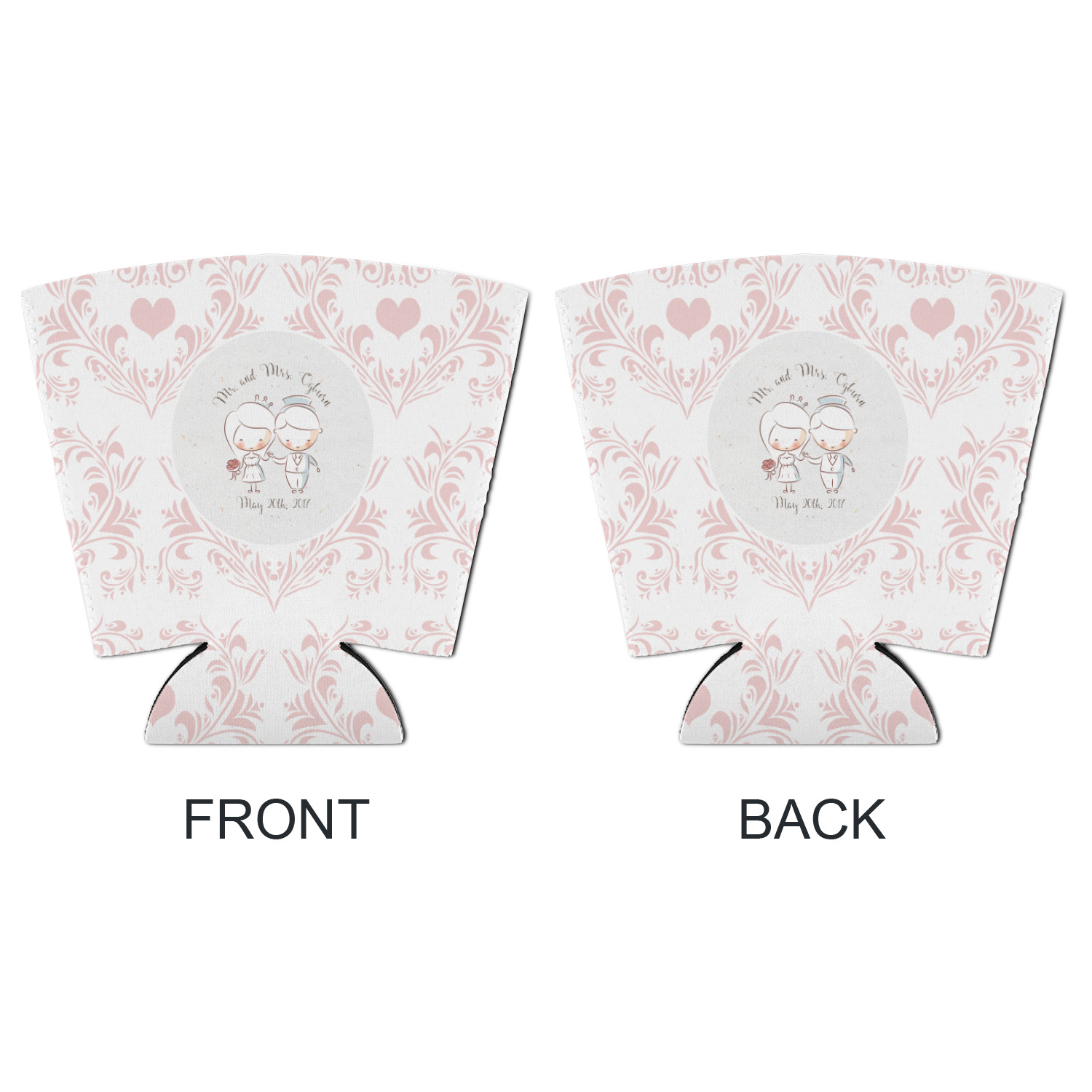 This design has an adorable bride and groom at the center of attention. They sit holding hands on a speckle textured off-white background. Above and below them is where the personalization goes, with the bride and groom's names and wedding date or whatever you choose. The textured background is a circle that surrounds the bride and groom while another background sits behind this circle. The secondary background is a white and light pink heart damask pattern, which looks adorable with the couples and their sweet rosy cheeks.