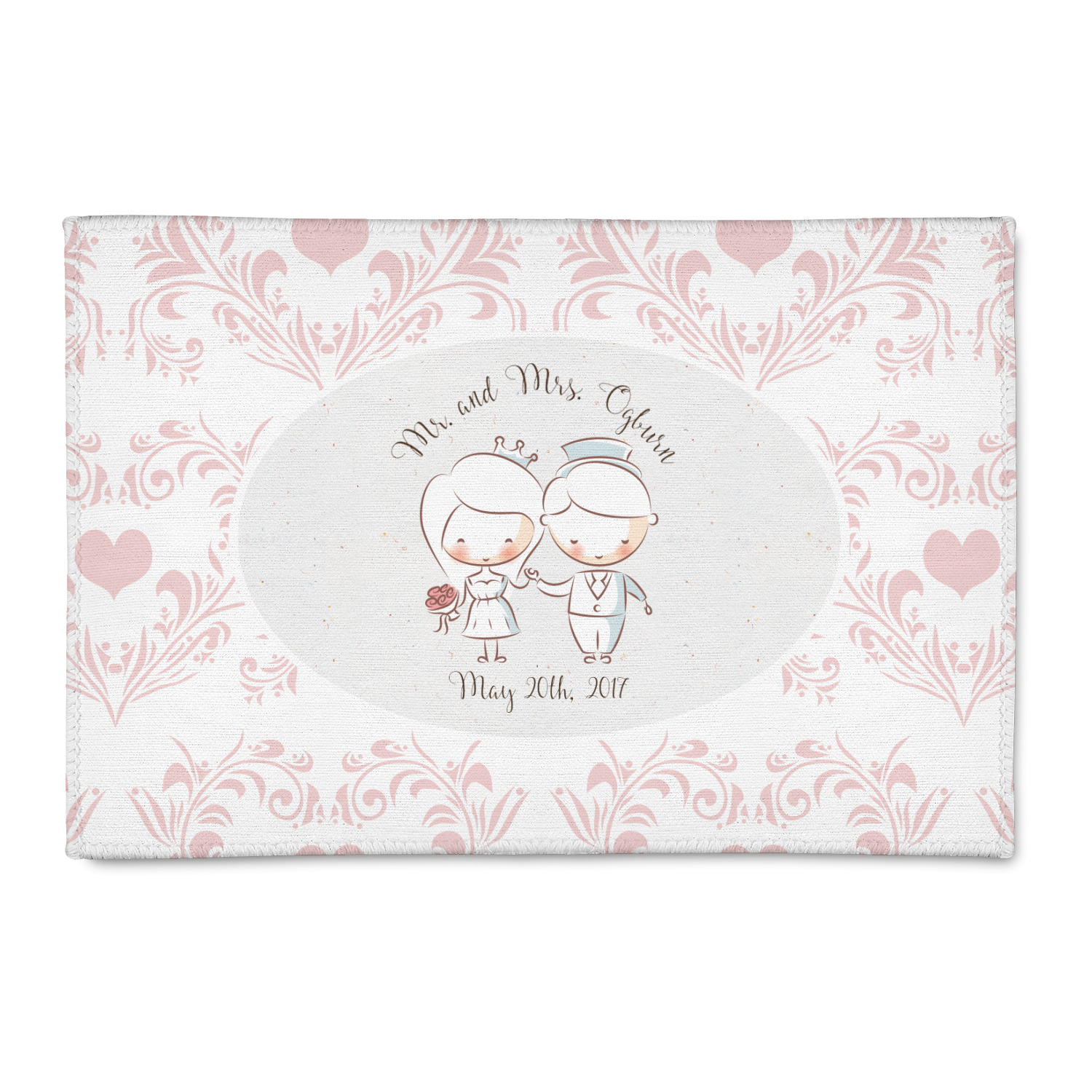 This design has an adorable bride and groom at the center of attention. They sit holding hands on a speckle textured off-white background. Above and below them is where the personalization goes, with the bride and groom's names and wedding date or whatever you choose. The textured background is a circle that surrounds the bride and groom while another background sits behind this circle. The secondary background is a white and light pink heart damask pattern, which looks adorable with the couples and their sweet rosy cheeks.
