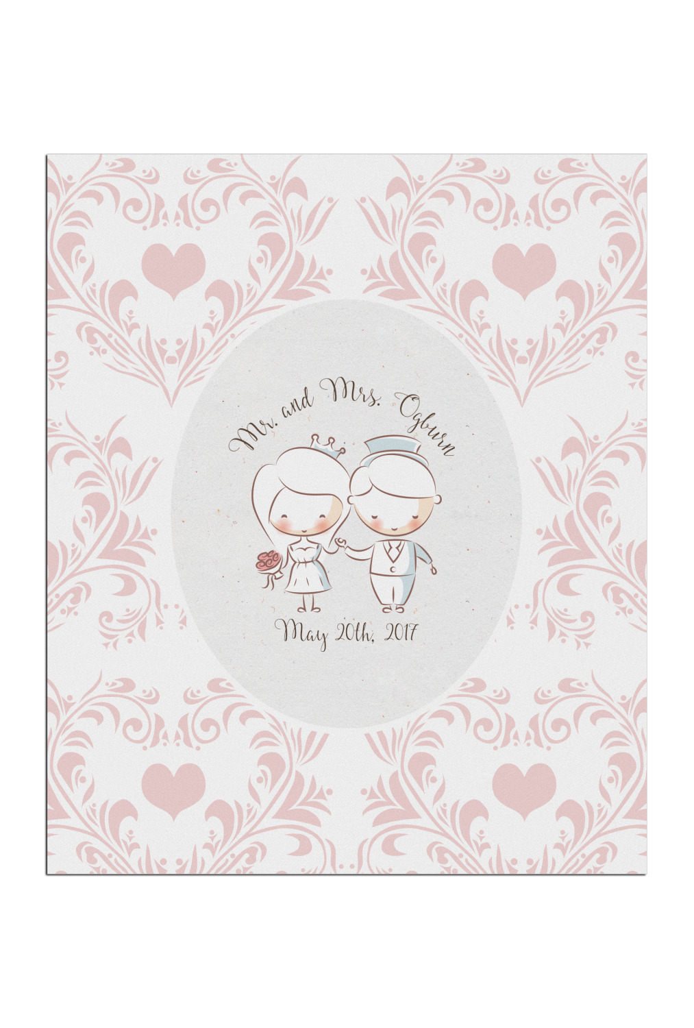 This design has an adorable bride and groom at the center of attention. They sit holding hands on a speckle textured off-white background. Above and below them is where the personalization goes, with the bride and groom's names and wedding date or whatever you choose. The textured background is a circle that surrounds the bride and groom while another background sits behind this circle. The secondary background is a white and light pink heart damask pattern, which looks adorable with the couples and their sweet rosy cheeks.