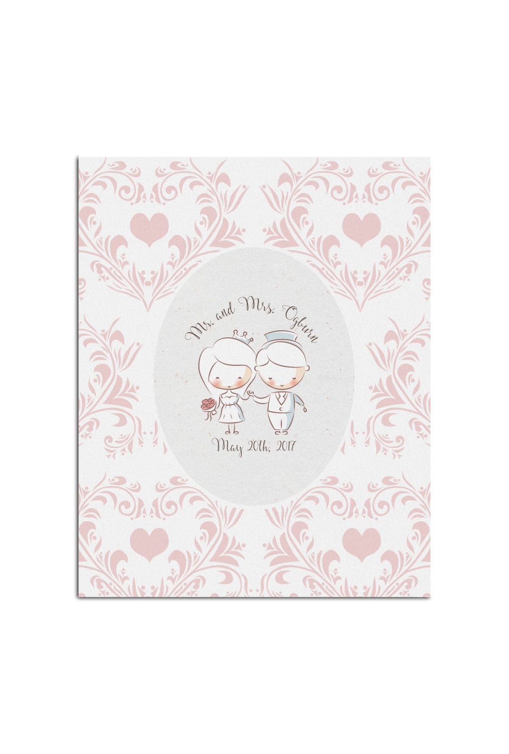 This design has an adorable bride and groom at the center of attention. They sit holding hands on a speckle textured off-white background. Above and below them is where the personalization goes, with the bride and groom's names and wedding date or whatever you choose. The textured background is a circle that surrounds the bride and groom while another background sits behind this circle. The secondary background is a white and light pink heart damask pattern, which looks adorable with the couples and their sweet rosy cheeks.