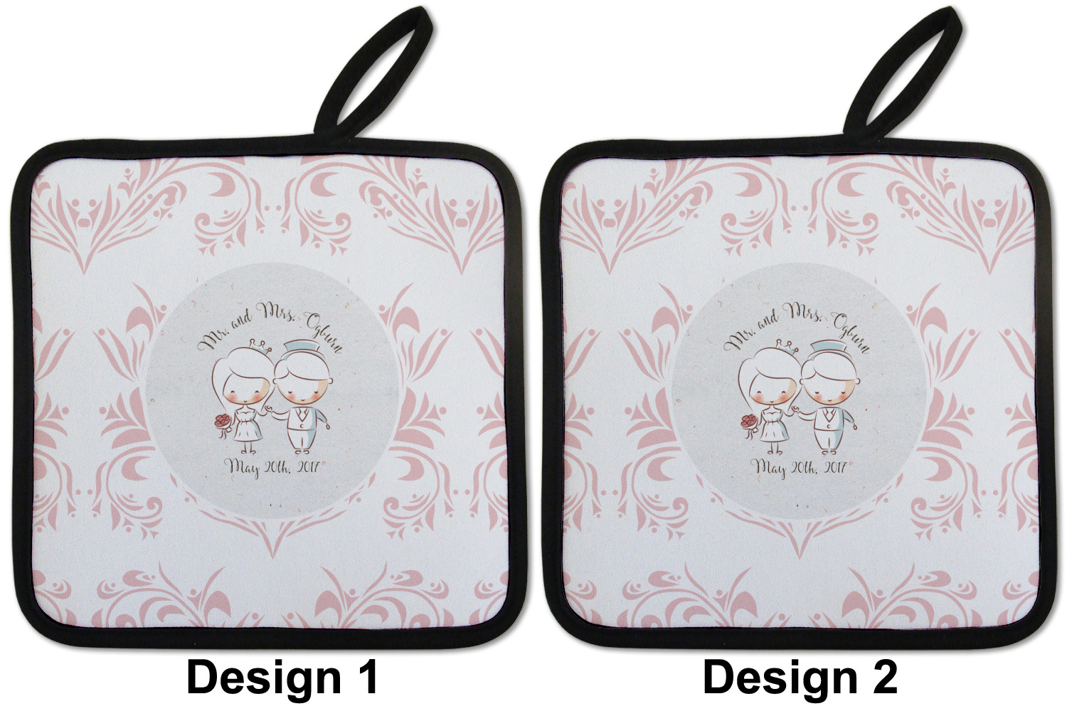 Our personalized pot holders feature a neoprene front that displays your personalization in vibrant colors. The backing of the hot pot holder is rubberized; the textured backing allows you to have a great grip when using this custom pot holder. The two materials are joined with a sleek, black trim, and the holder also includes an attached loop for hanging and storage. The pot holder is approximately 8.75 inches by 8.75 inches and 0.25 inches tall, while the fabric loop is 2.5 inches long. You can purchase a kitchen pot holder by itself or as a set of 2. We also offer a set including one pot holder and one oven mitt.