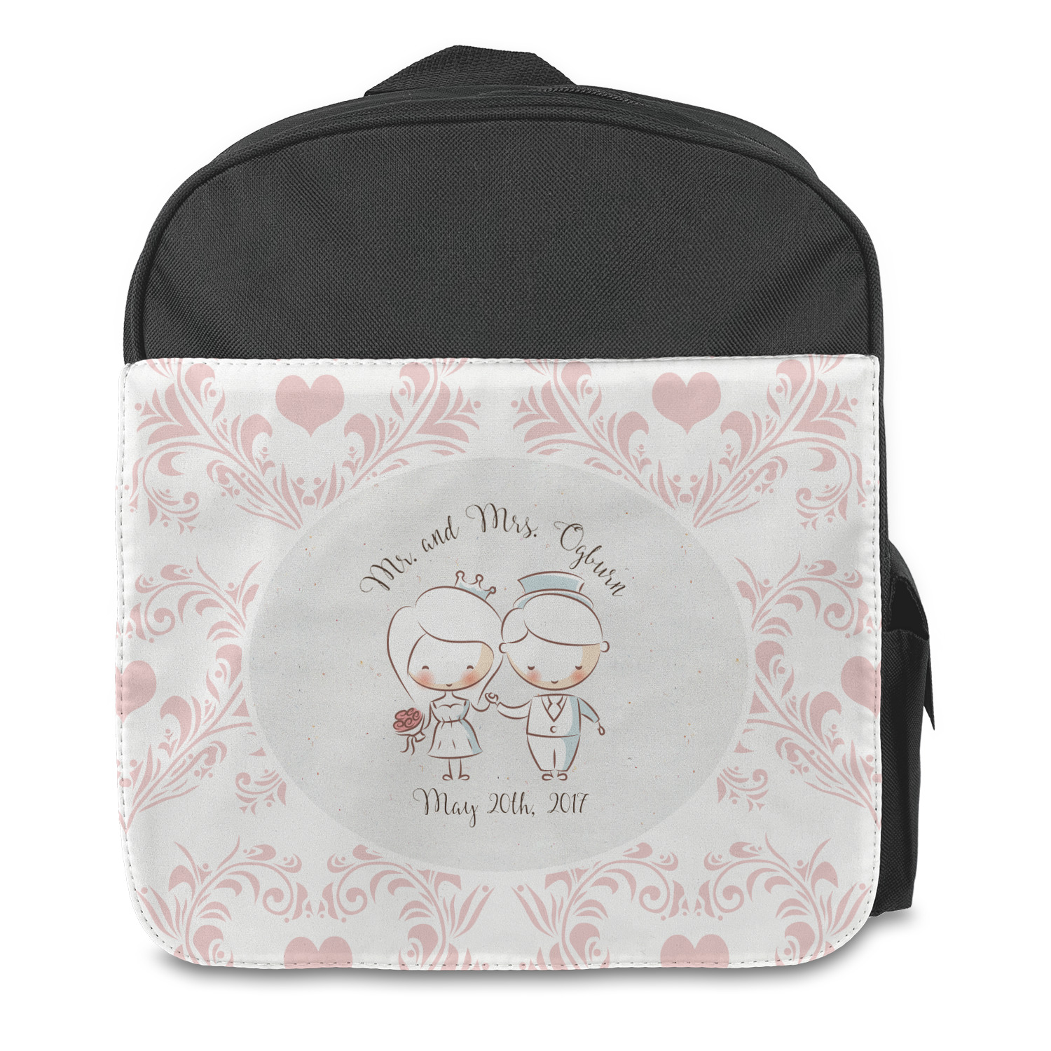 This design has an adorable bride and groom at the center of attention. They sit holding hands on a speckle textured off-white background. Above and below them is where the personalization goes, with the bride and groom's names and wedding date or whatever you choose. The textured background is a circle that surrounds the bride and groom while another background sits behind this circle. The secondary background is a white and light pink heart damask pattern, which looks adorable with the couples and their sweet rosy cheeks.