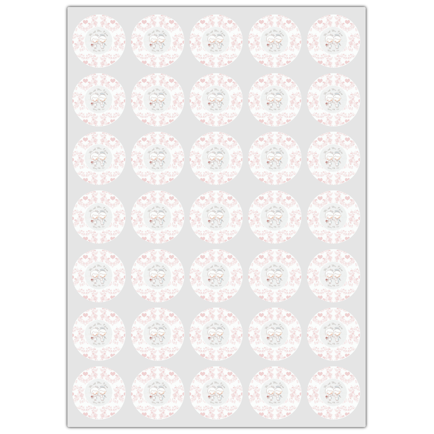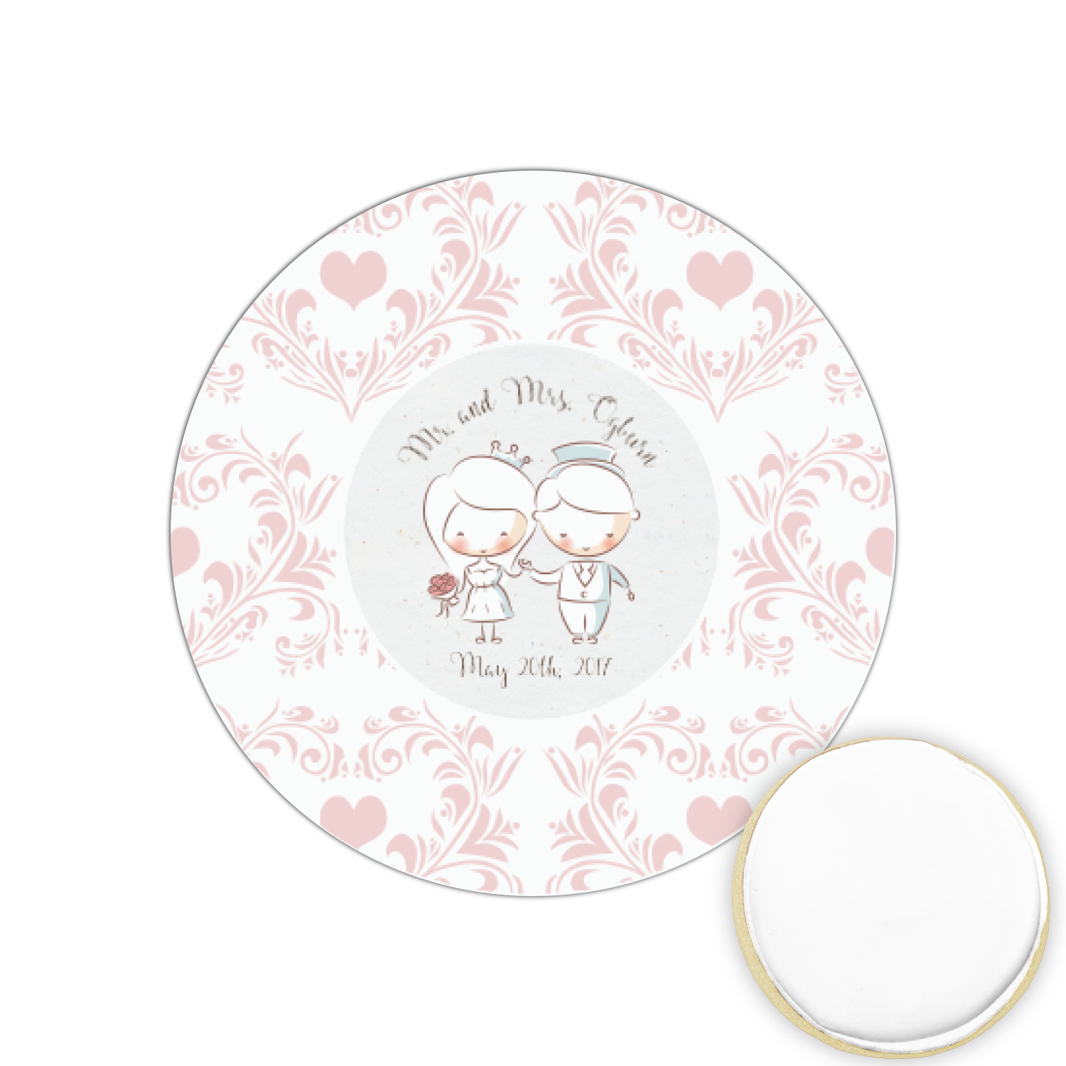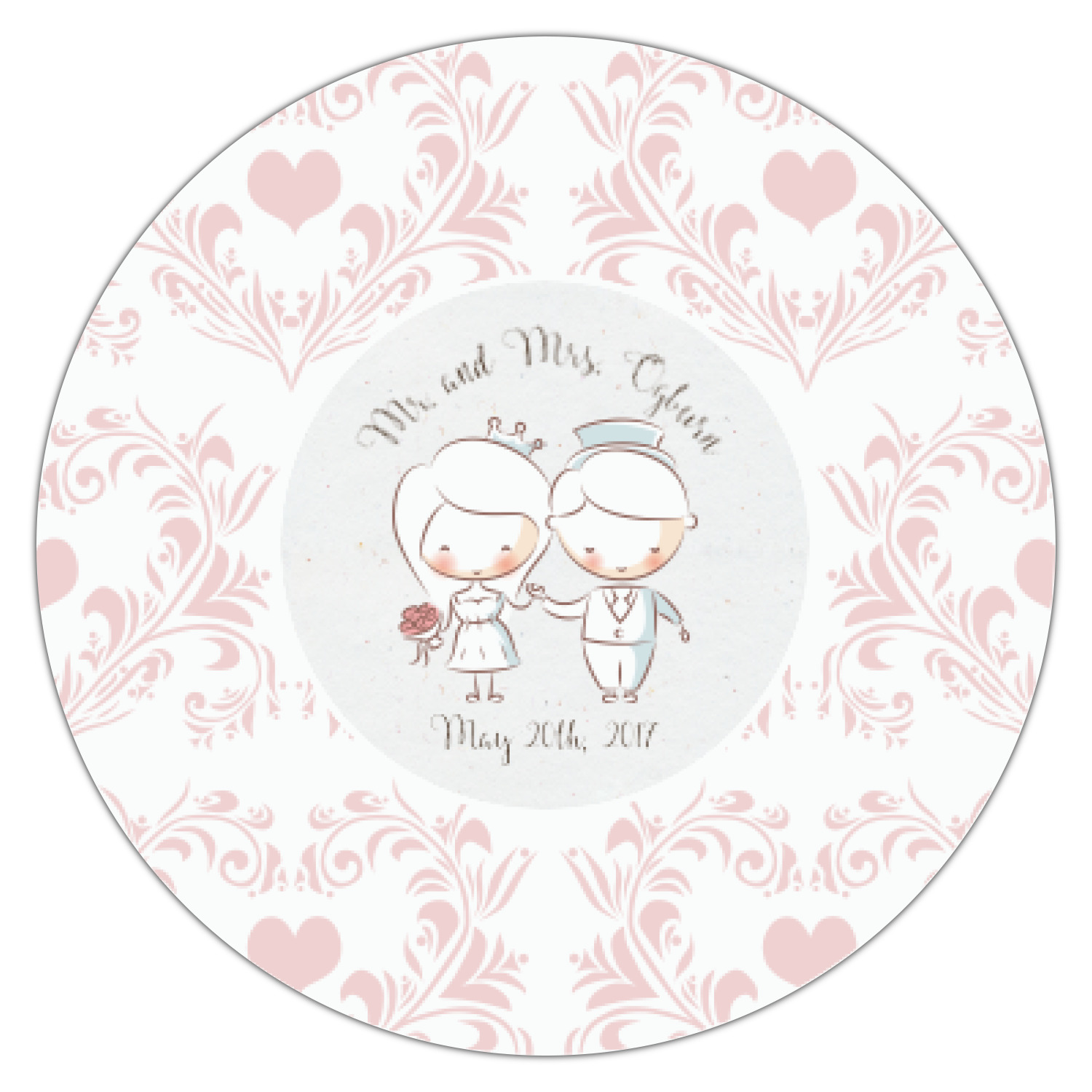 This design has an adorable bride and groom at the center of attention. They sit holding hands on a speckle textured off-white background. Above and below them is where the personalization goes, with the bride and groom's names and wedding date or whatever you choose. The textured background is a circle that surrounds the bride and groom while another background sits behind this circle. The secondary background is a white and light pink heart damask pattern, which looks adorable with the couples and their sweet rosy cheeks.