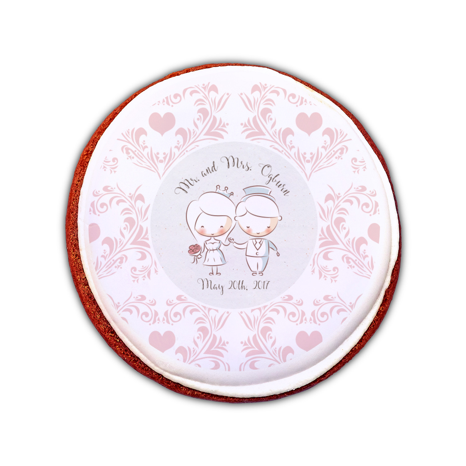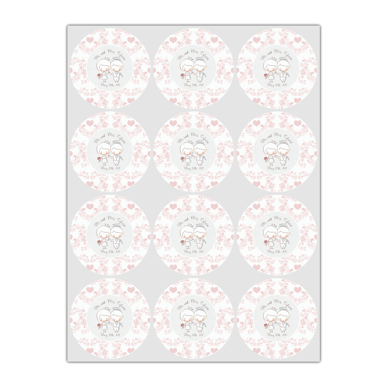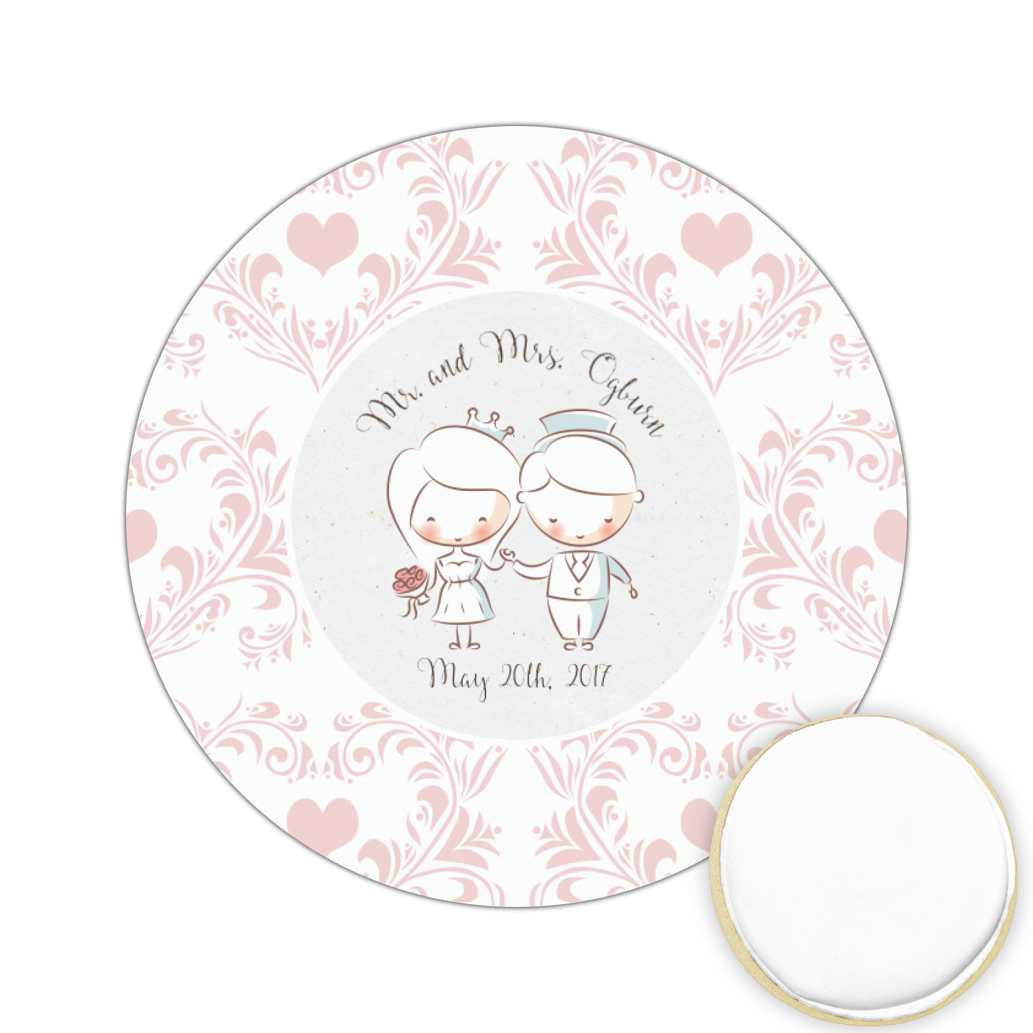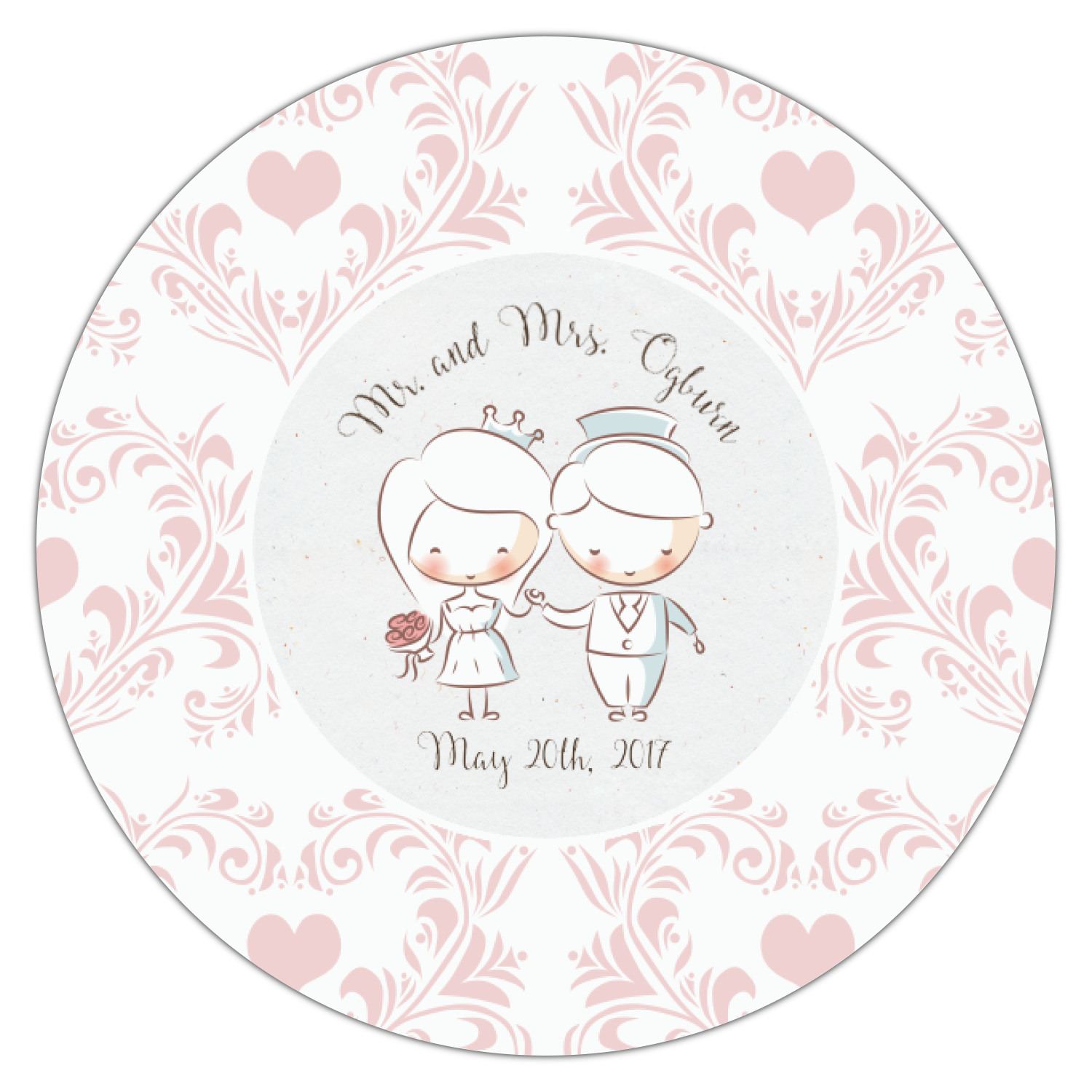 This design has an adorable bride and groom at the center of attention. They sit holding hands on a speckle textured off-white background. Above and below them is where the personalization goes, with the bride and groom's names and wedding date or whatever you choose. The textured background is a circle that surrounds the bride and groom while another background sits behind this circle. The secondary background is a white and light pink heart damask pattern, which looks adorable with the couples and their sweet rosy cheeks.