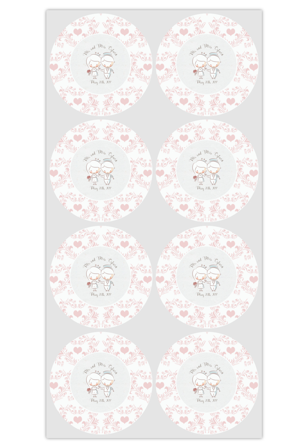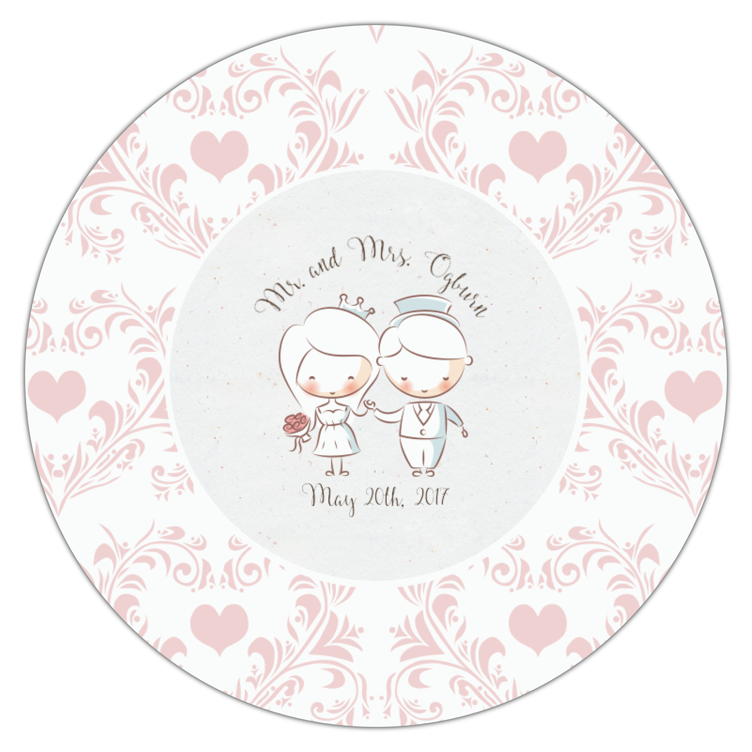 This design has an adorable bride and groom at the center of attention. They sit holding hands on a speckle textured off-white background. Above and below them is where the personalization goes, with the bride and groom's names and wedding date or whatever you choose. The textured background is a circle that surrounds the bride and groom while another background sits behind this circle. The secondary background is a white and light pink heart damask pattern, which looks adorable with the couples and their sweet rosy cheeks.
