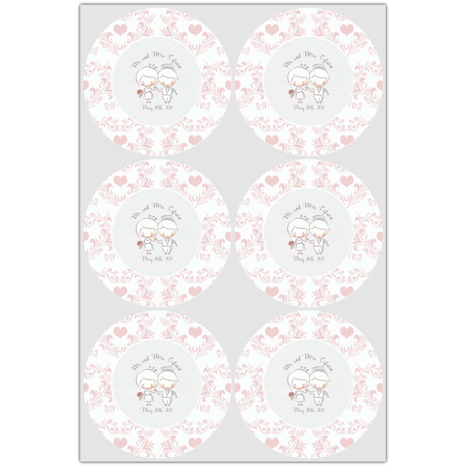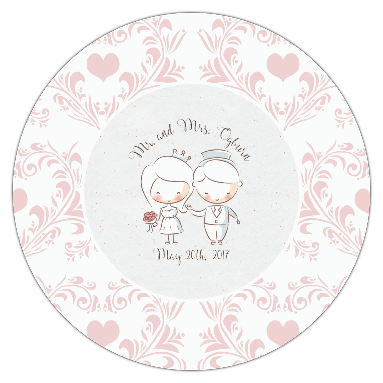 This design has an adorable bride and groom at the center of attention. They sit holding hands on a speckle textured off-white background. Above and below them is where the personalization goes, with the bride and groom's names and wedding date or whatever you choose. The textured background is a circle that surrounds the bride and groom while another background sits behind this circle. The secondary background is a white and light pink heart damask pattern, which looks adorable with the couples and their sweet rosy cheeks.