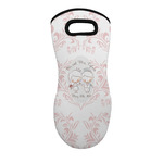 This design has an adorable bride and groom at the center of attention. They sit holding hands on a speckle textured off-white background. Above and below them is where the personalization goes, with the bride and groom's names and wedding date or whatever you choose. The textured background is a circle that surrounds the bride and groom while another background sits behind this circle. The secondary background is a white and light pink heart damask pattern, which looks adorable with the couples and their sweet rosy cheeks.