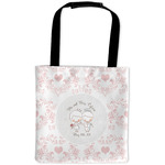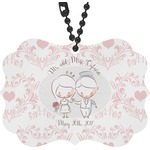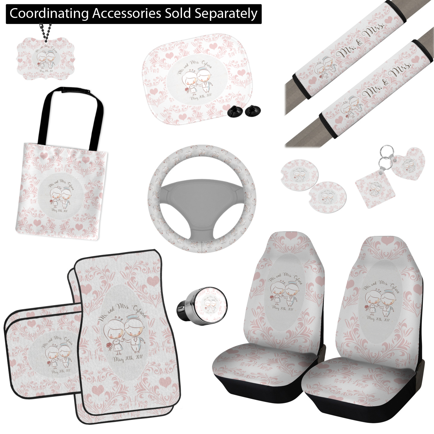 This design has an adorable bride and groom at the center of attention. They sit holding hands on a speckle textured off-white background. Above and below them is where the personalization goes, with the bride and groom's names and wedding date or whatever you choose. The textured background is a circle that surrounds the bride and groom while another background sits behind this circle. The secondary background is a white and light pink heart damask pattern, which looks adorable with the couples and their sweet rosy cheeks.