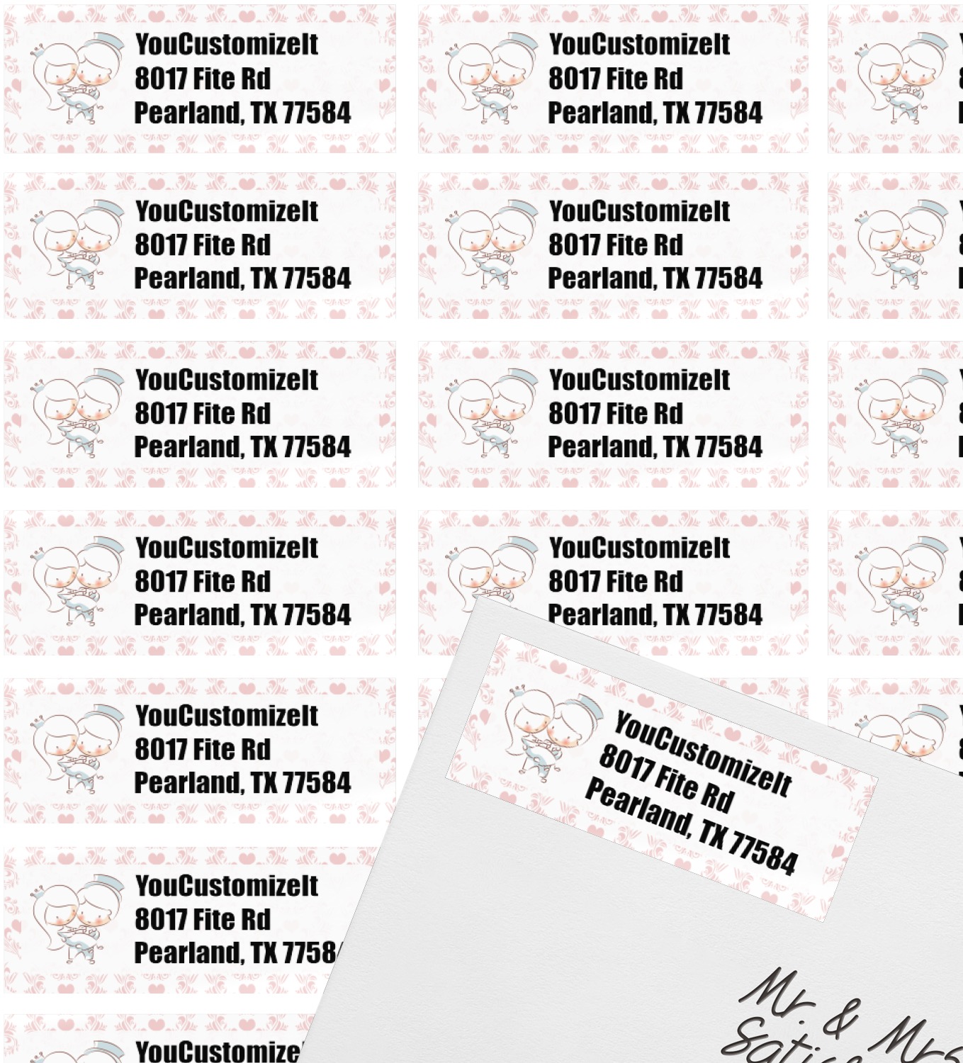 This design has an adorable bride and groom at the center of attention. They sit holding hands on a speckle textured off-white background. Above and below them is where the personalization goes, with the bride and groom's names and wedding date or whatever you choose. The textured background is a circle that surrounds the bride and groom while another background sits behind this circle. The secondary background is a white and light pink heart damask pattern, which looks adorable with the couples and their sweet rosy cheeks.