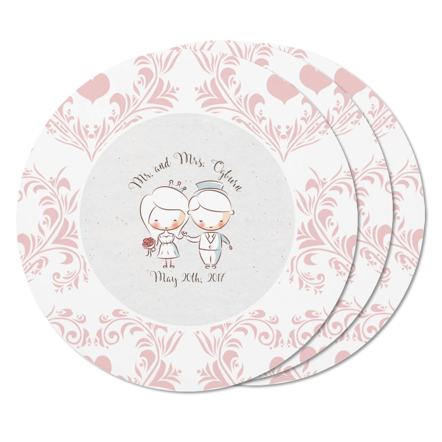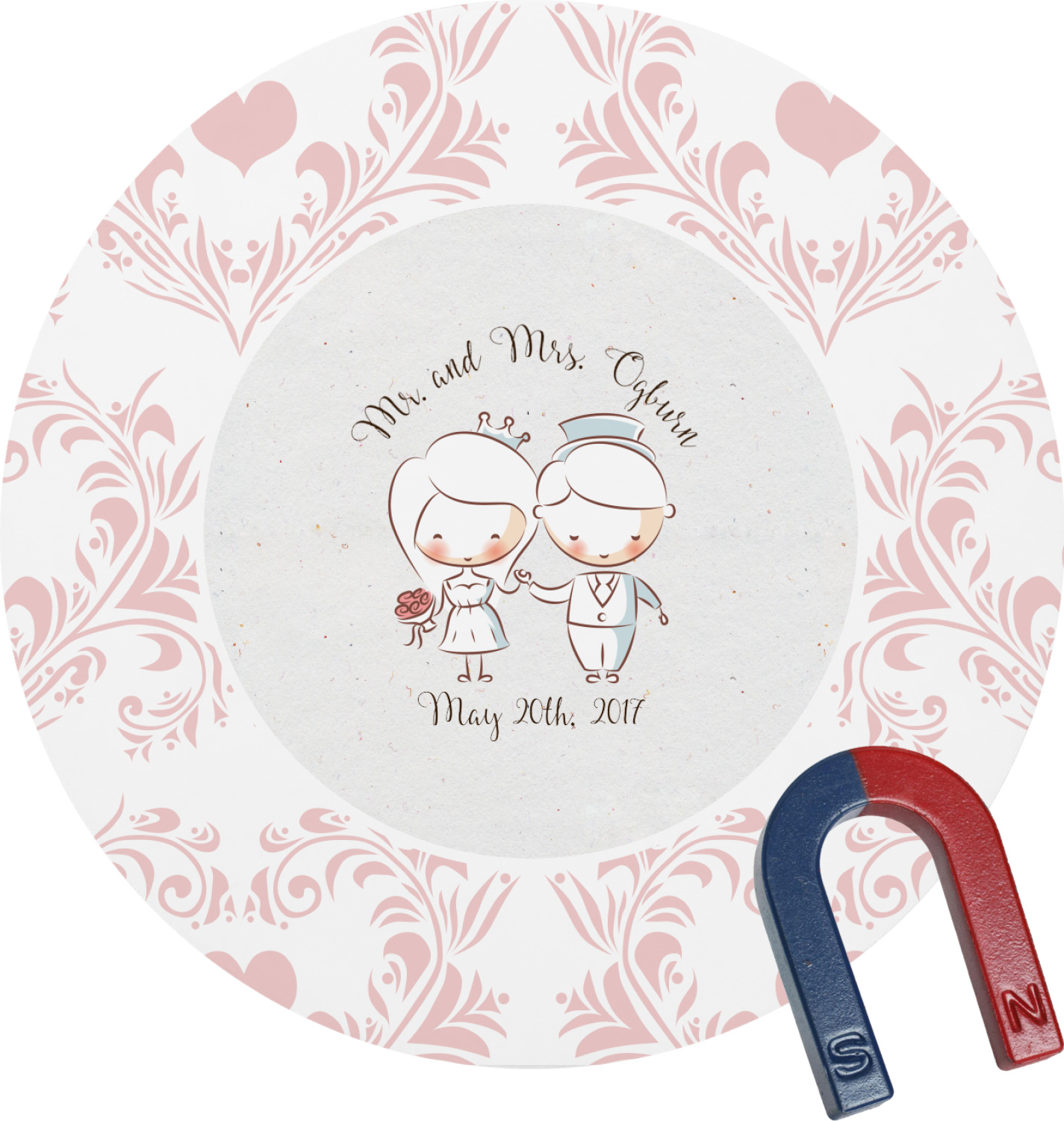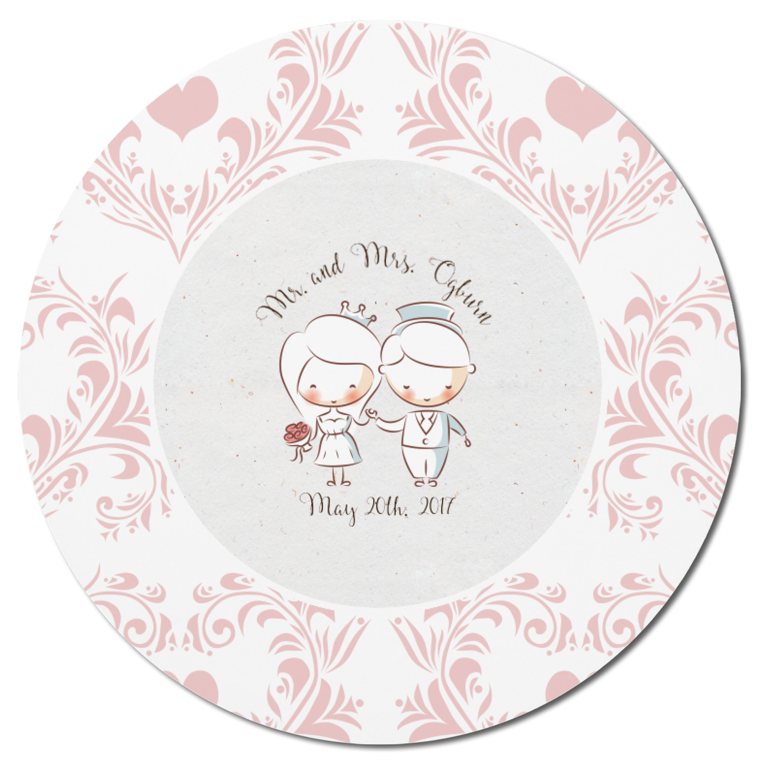 This design has an adorable bride and groom at the center of attention. They sit holding hands on a speckle textured off-white background. Above and below them is where the personalization goes, with the bride and groom's names and wedding date or whatever you choose. The textured background is a circle that surrounds the bride and groom while another background sits behind this circle. The secondary background is a white and light pink heart damask pattern, which looks adorable with the couples and their sweet rosy cheeks.