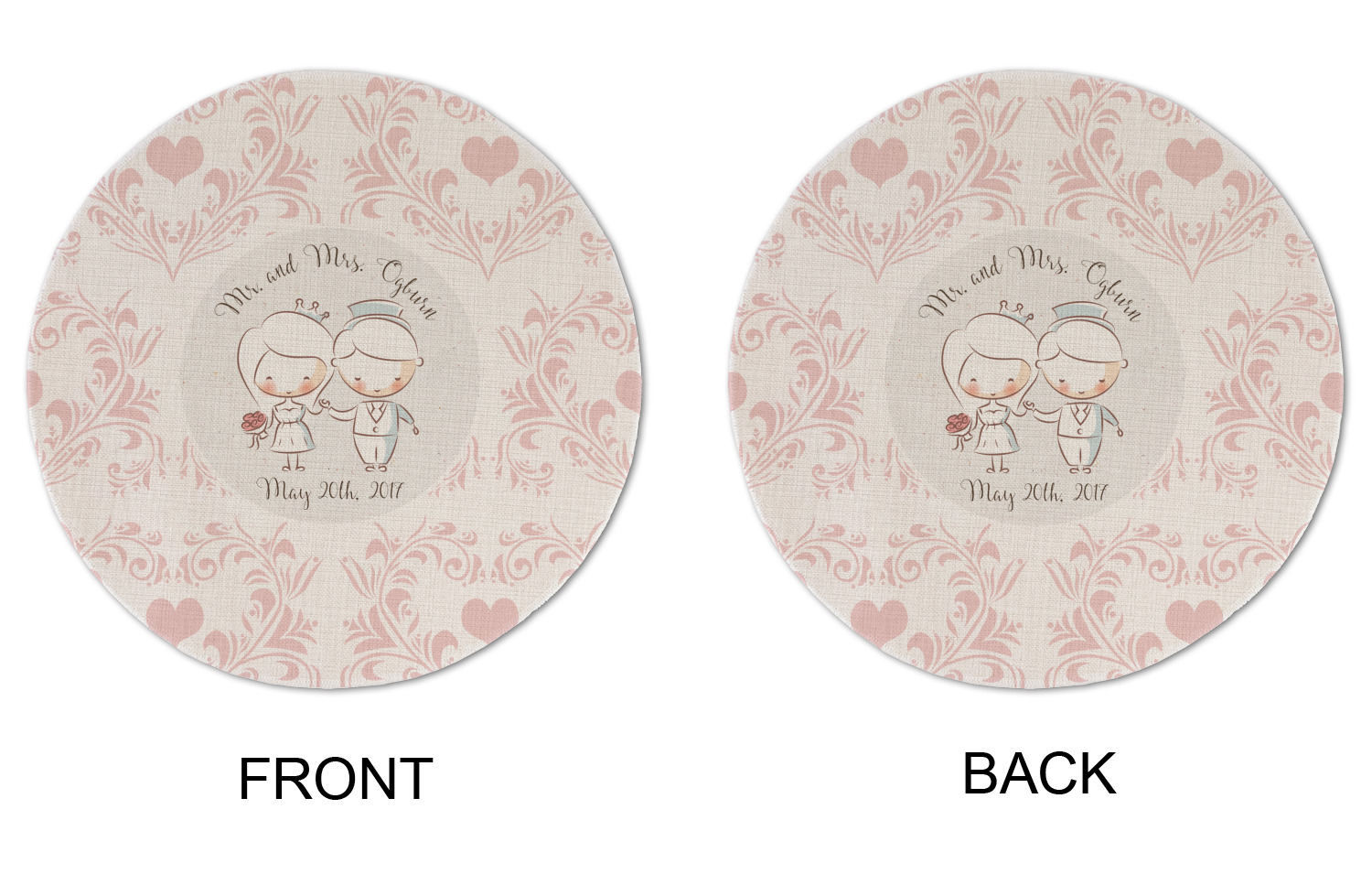 This design has an adorable bride and groom at the center of attention. They sit holding hands on a speckle textured off-white background. Above and below them is where the personalization goes, with the bride and groom's names and wedding date or whatever you choose. The textured background is a circle that surrounds the bride and groom while another background sits behind this circle. The secondary background is a white and light pink heart damask pattern, which looks adorable with the couples and their sweet rosy cheeks.