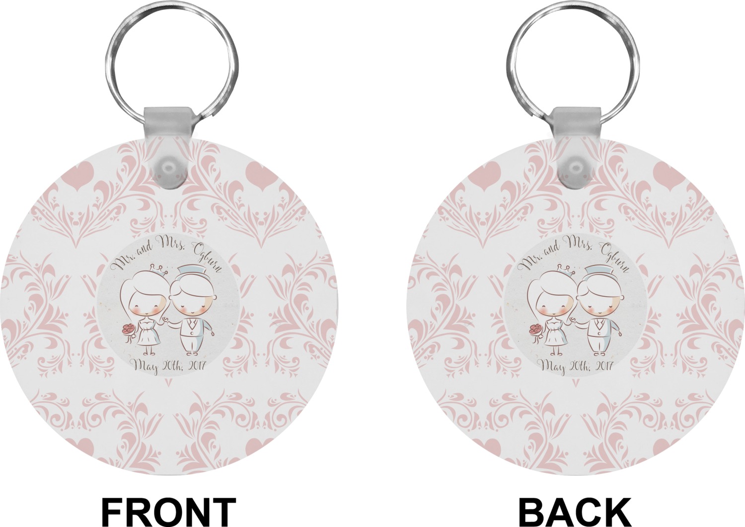 Our personalized keychains attach to the included metal, split key ring with a plastic, removable snap. Since a metal ring is included with your purchase, you have the liberty to keep your keys together on the ring, with or without your unique keychain. We offer this keychain in three different shapes: circle, heart, or diamond. We print your personalized design(s) on both sides of the key chain, and the surface has a glossy, reflective finish that only emphasizes your design. Each keychain is approximately 2.25 by 2.25 inches.