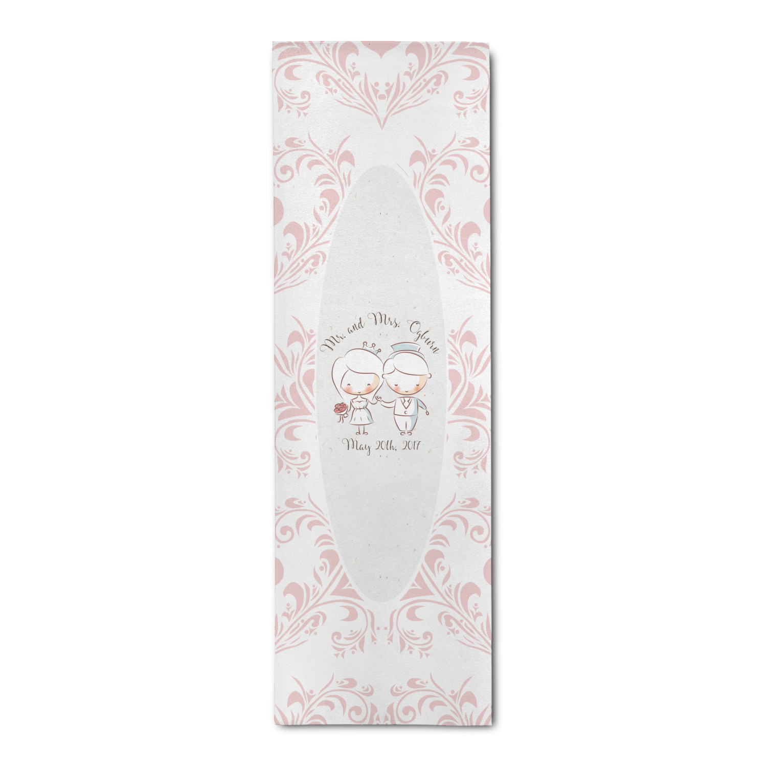 This design has an adorable bride and groom at the center of attention. They sit holding hands on a speckle textured off-white background. Above and below them is where the personalization goes, with the bride and groom's names and wedding date or whatever you choose. The textured background is a circle that surrounds the bride and groom while another background sits behind this circle. The secondary background is a white and light pink heart damask pattern, which looks adorable with the couples and their sweet rosy cheeks.