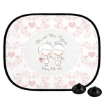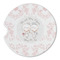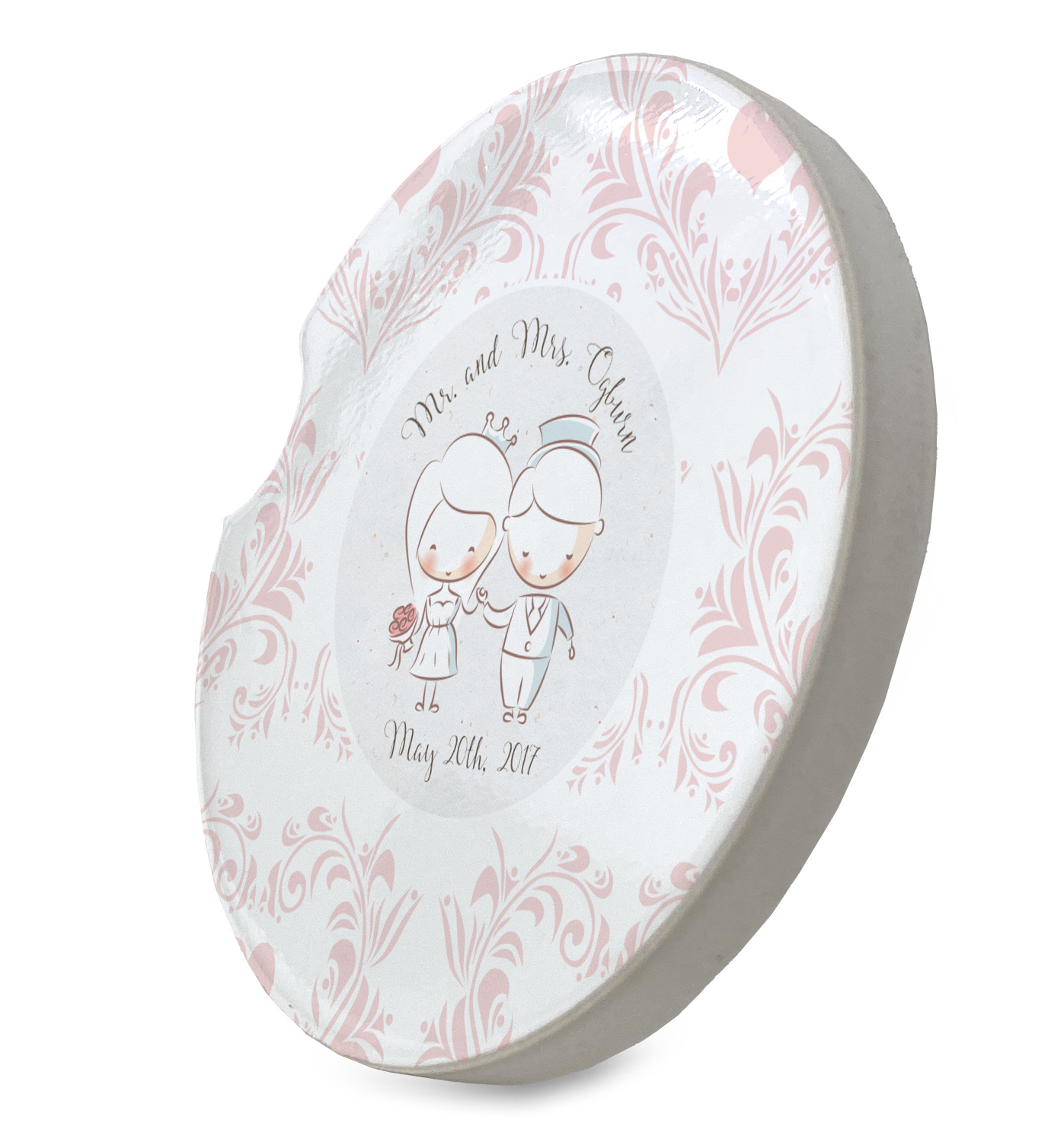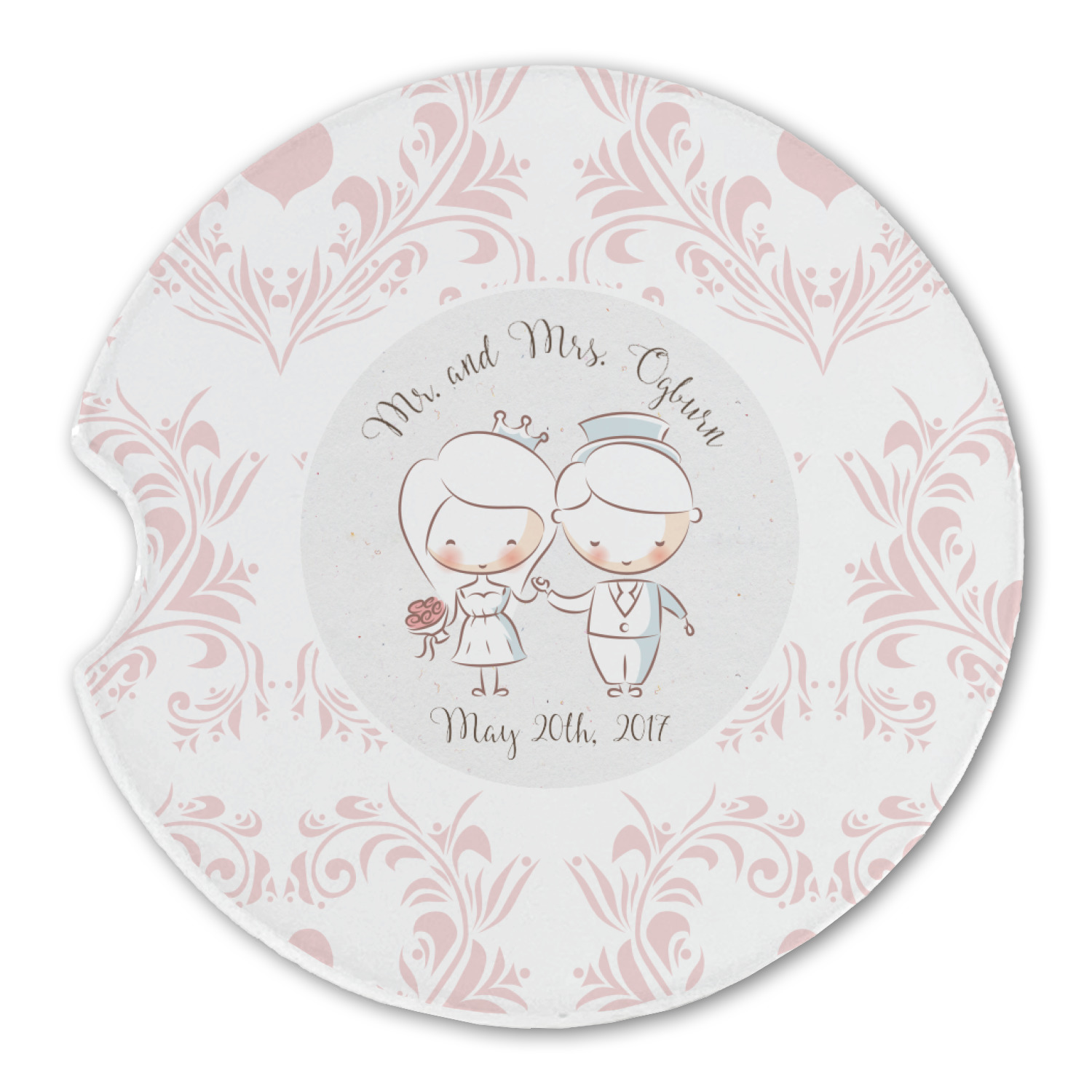 This design has an adorable bride and groom at the center of attention. They sit holding hands on a speckle textured off-white background. Above and below them is where the personalization goes, with the bride and groom's names and wedding date or whatever you choose. The textured background is a circle that surrounds the bride and groom while another background sits behind this circle. The secondary background is a white and light pink heart damask pattern, which looks adorable with the couples and their sweet rosy cheeks.