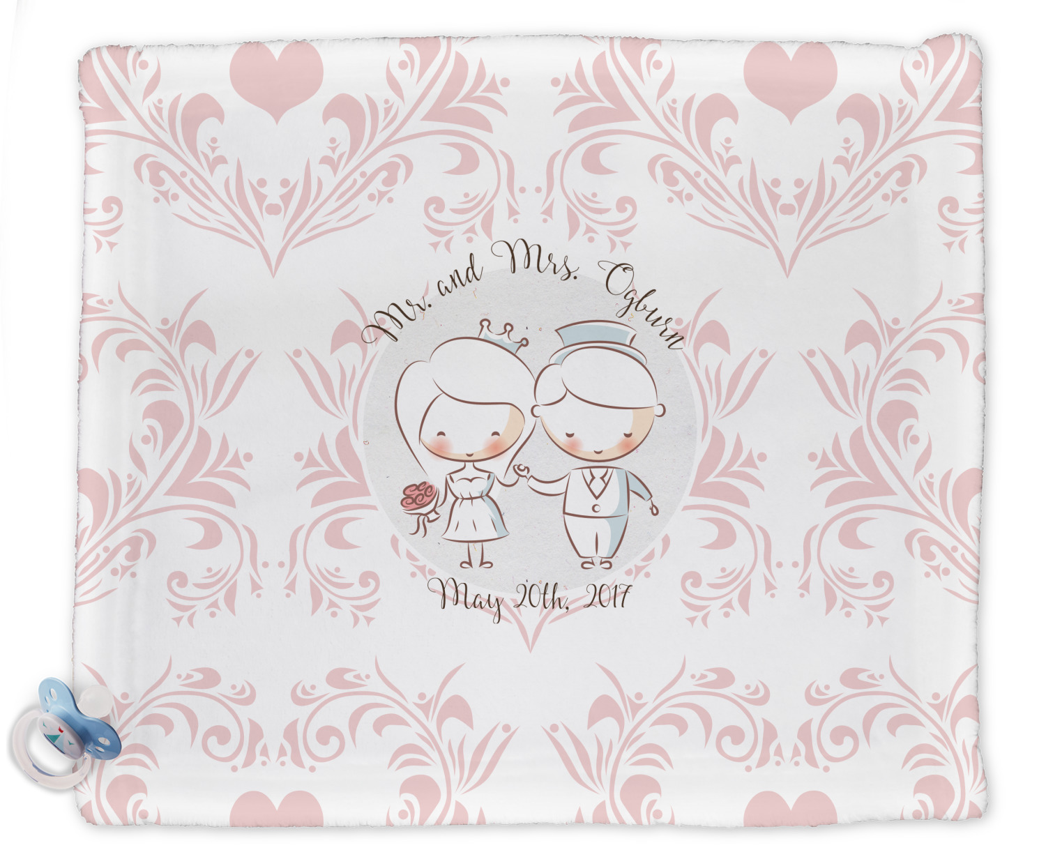 This design has an adorable bride and groom at the center of attention. They sit holding hands on a speckle textured off-white background. Above and below them is where the personalization goes, with the bride and groom's names and wedding date or whatever you choose. The textured background is a circle that surrounds the bride and groom while another background sits behind this circle. The secondary background is a white and light pink heart damask pattern, which looks adorable with the couples and their sweet rosy cheeks.
