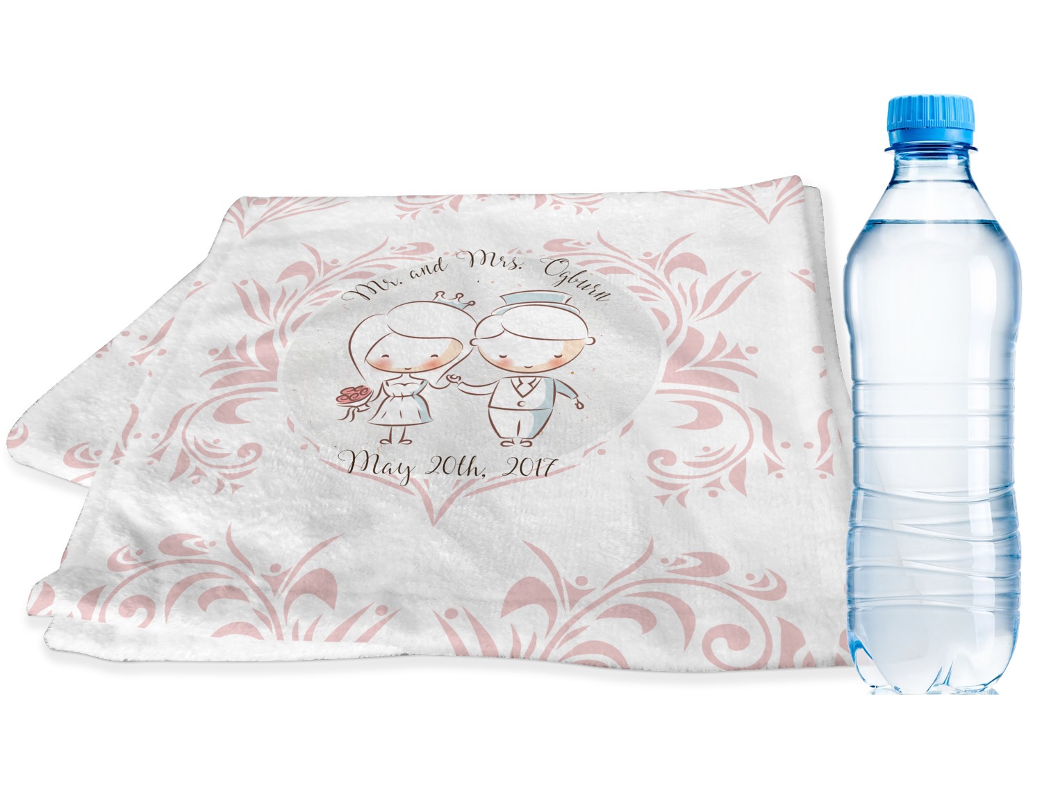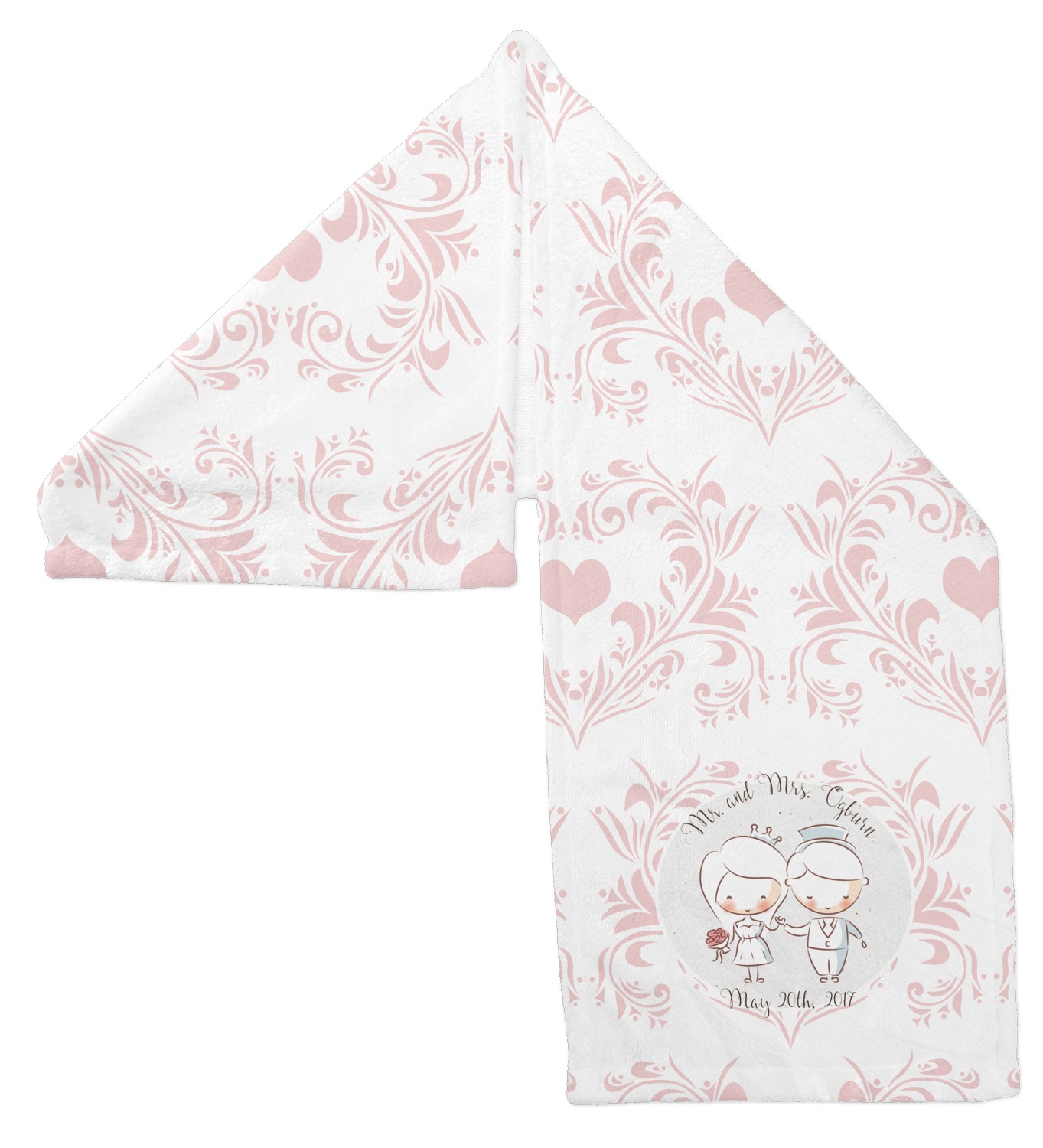 This design has an adorable bride and groom at the center of attention. They sit holding hands on a speckle textured off-white background. Above and below them is where the personalization goes, with the bride and groom's names and wedding date or whatever you choose. The textured background is a circle that surrounds the bride and groom while another background sits behind this circle. The secondary background is a white and light pink heart damask pattern, which looks adorable with the couples and their sweet rosy cheeks.