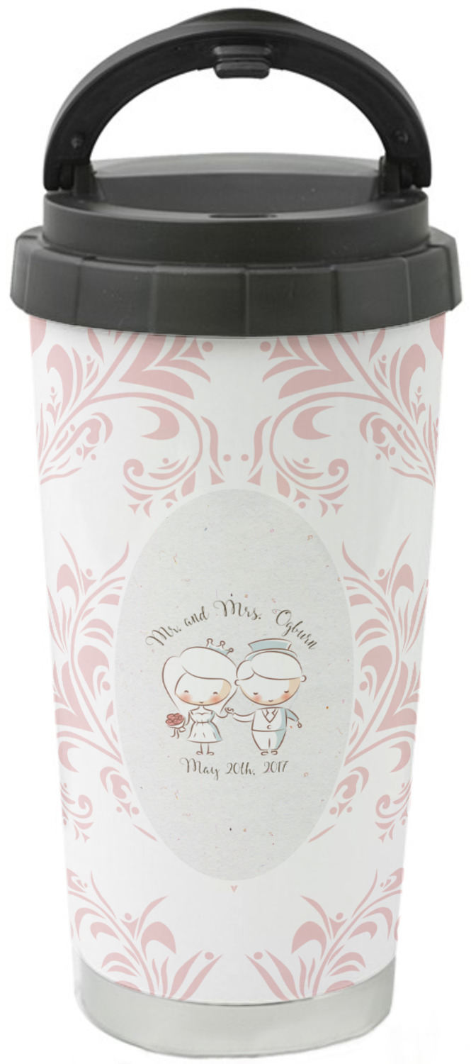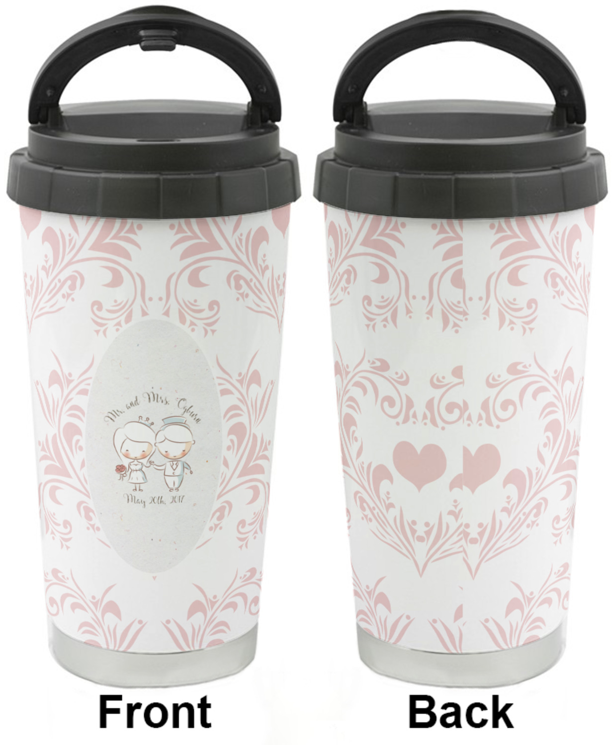 This design has an adorable bride and groom at the center of attention. They sit holding hands on a speckle textured off-white background. Above and below them is where the personalization goes, with the bride and groom's names and wedding date or whatever you choose. The textured background is a circle that surrounds the bride and groom while another background sits behind this circle. The secondary background is a white and light pink heart damask pattern, which looks adorable with the couples and their sweet rosy cheeks.