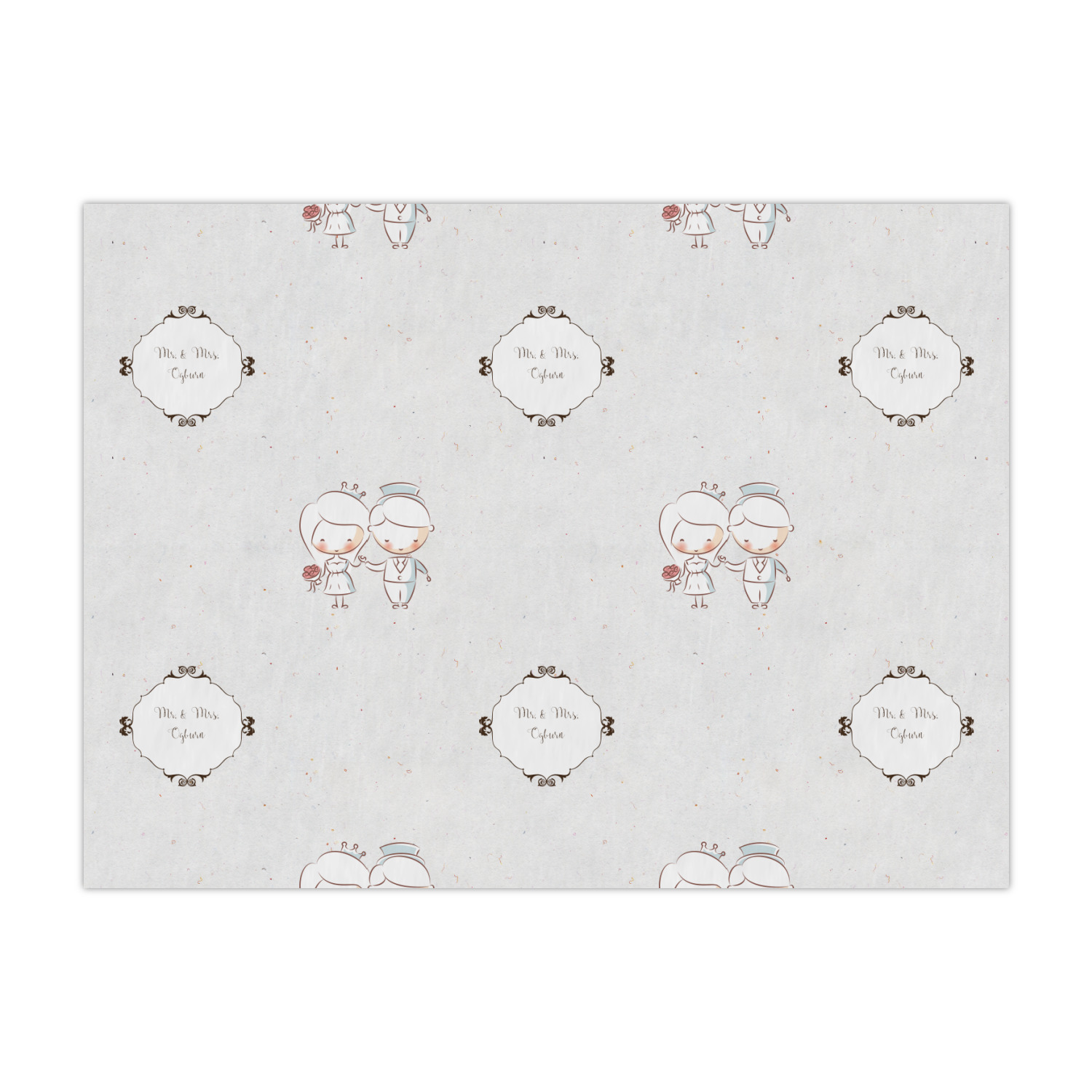 This design has an adorable bride and groom at the center of attention. They sit holding hands on a speckle textured off-white background. Above and below them is where the personalization goes, with the bride and groom's names and wedding date or whatever you choose. The textured background is a circle that surrounds the bride and groom while another background sits behind this circle. The secondary background is a white and light pink heart damask pattern, which looks adorable with the couples and their sweet rosy cheeks.