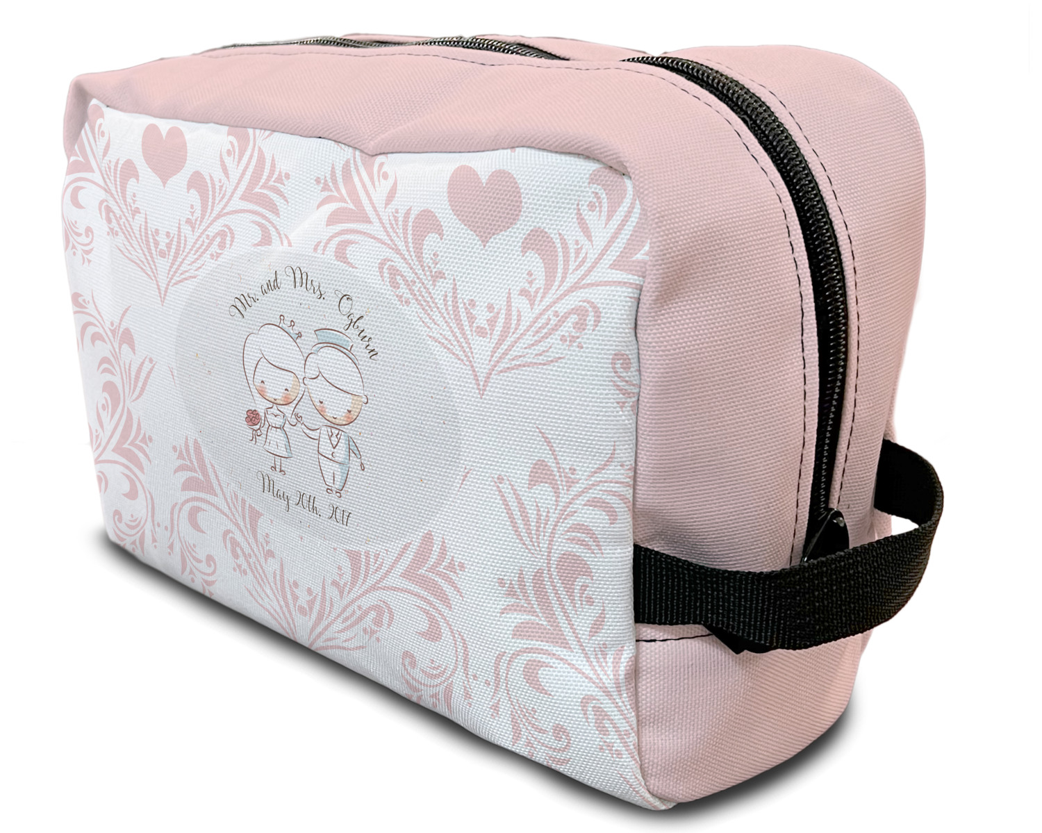 This design has an adorable bride and groom at the center of attention. They sit holding hands on a speckle textured off-white background. Above and below them is where the personalization goes, with the bride and groom's names and wedding date or whatever you choose. The textured background is a circle that surrounds the bride and groom while another background sits behind this circle. The secondary background is a white and light pink heart damask pattern, which looks adorable with the couples and their sweet rosy cheeks.