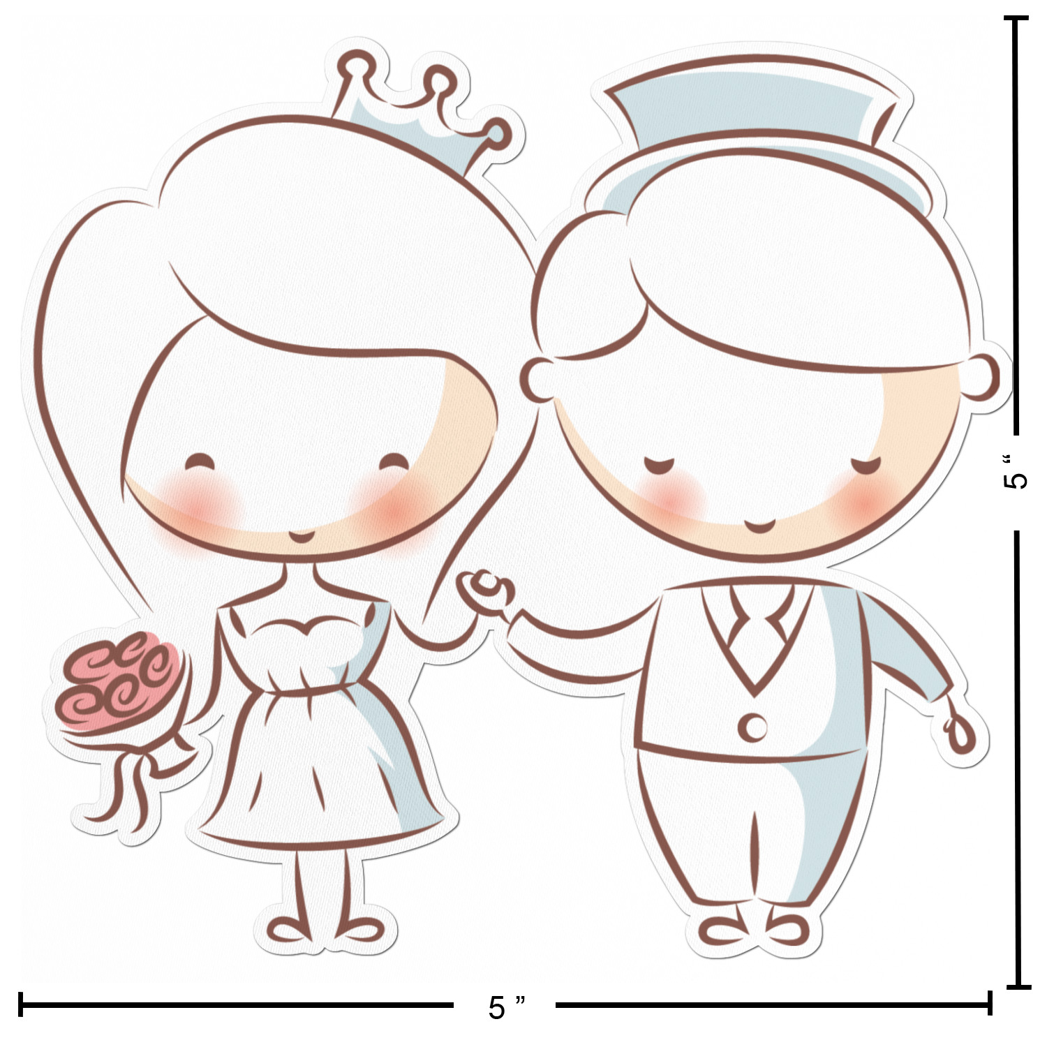 This design has an adorable bride and groom at the center of attention. They sit holding hands on a speckle textured off-white background. Above and below them is where the personalization goes, with the bride and groom's names and wedding date or whatever you choose. The textured background is a circle that surrounds the bride and groom while another background sits behind this circle. The secondary background is a white and light pink heart damask pattern, which looks adorable with the couples and their sweet rosy cheeks.