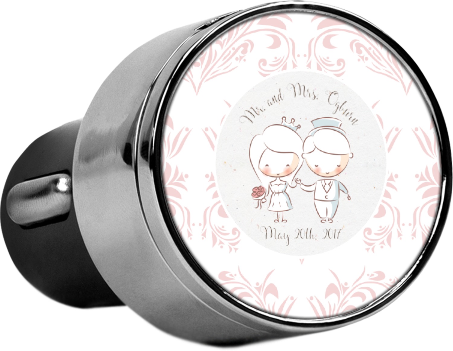 This car charger adapter converts your cars bland cigarette lighter into a decorative, personalized, and operational USB charging port. Made of solid, silver-plated metal, these chargers feature a flip-open lid that both displays your customized design and conceals two USB ports. The metal lid of the USB car charger adapter is 1.5" in diameter and seals due to a small, ingrained magnet on both the charger and its lid. The cigarette lighter insert, itself, is colored black.