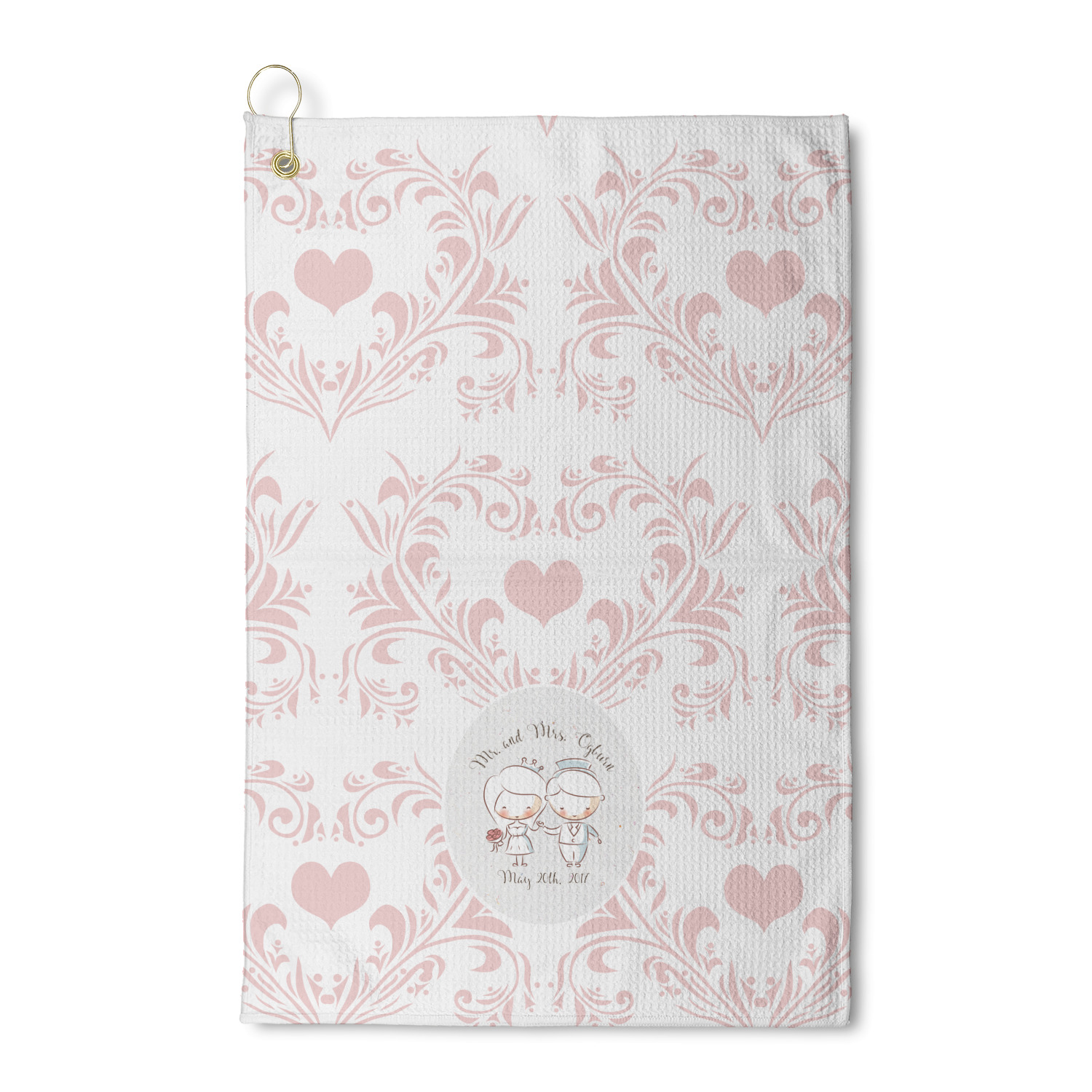 This design has an adorable bride and groom at the center of attention. They sit holding hands on a speckle textured off-white background. Above and below them is where the personalization goes, with the bride and groom's names and wedding date or whatever you choose. The textured background is a circle that surrounds the bride and groom while another background sits behind this circle. The secondary background is a white and light pink heart damask pattern, which looks adorable with the couples and their sweet rosy cheeks.