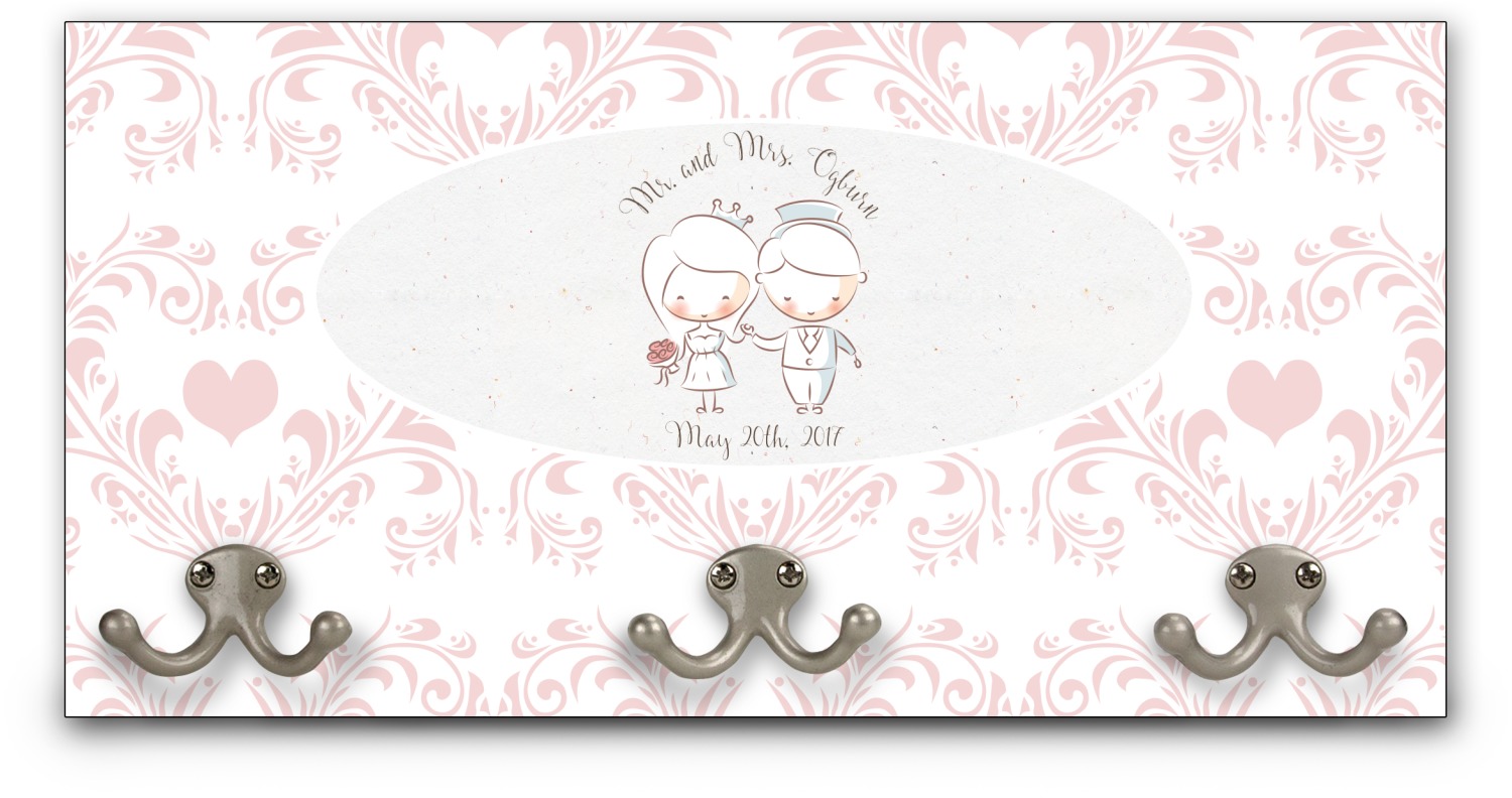 This coat rack is the perfect way to add some personality to your wall or entryway. The board is made of a strong maple that is approximately 16" x 8". The three 2-prong hooks are a sturdy metal that have three screws attaching them to the board. Your design is printed right onto the front of the board while the back and sides are a simple black.