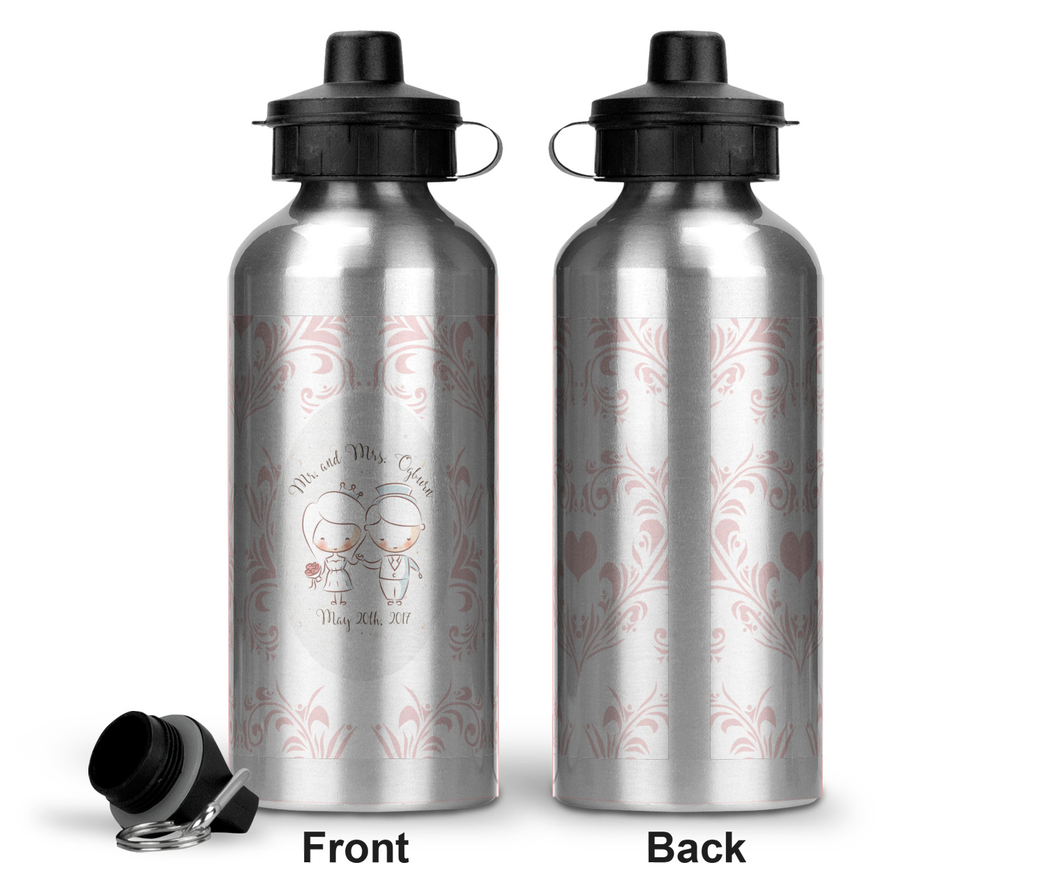 This design has an adorable bride and groom at the center of attention. They sit holding hands on a speckle textured off-white background. Above and below them is where the personalization goes, with the bride and groom's names and wedding date or whatever you choose. The textured background is a circle that surrounds the bride and groom while another background sits behind this circle. The secondary background is a white and light pink heart damask pattern, which looks adorable with the couples and their sweet rosy cheeks.