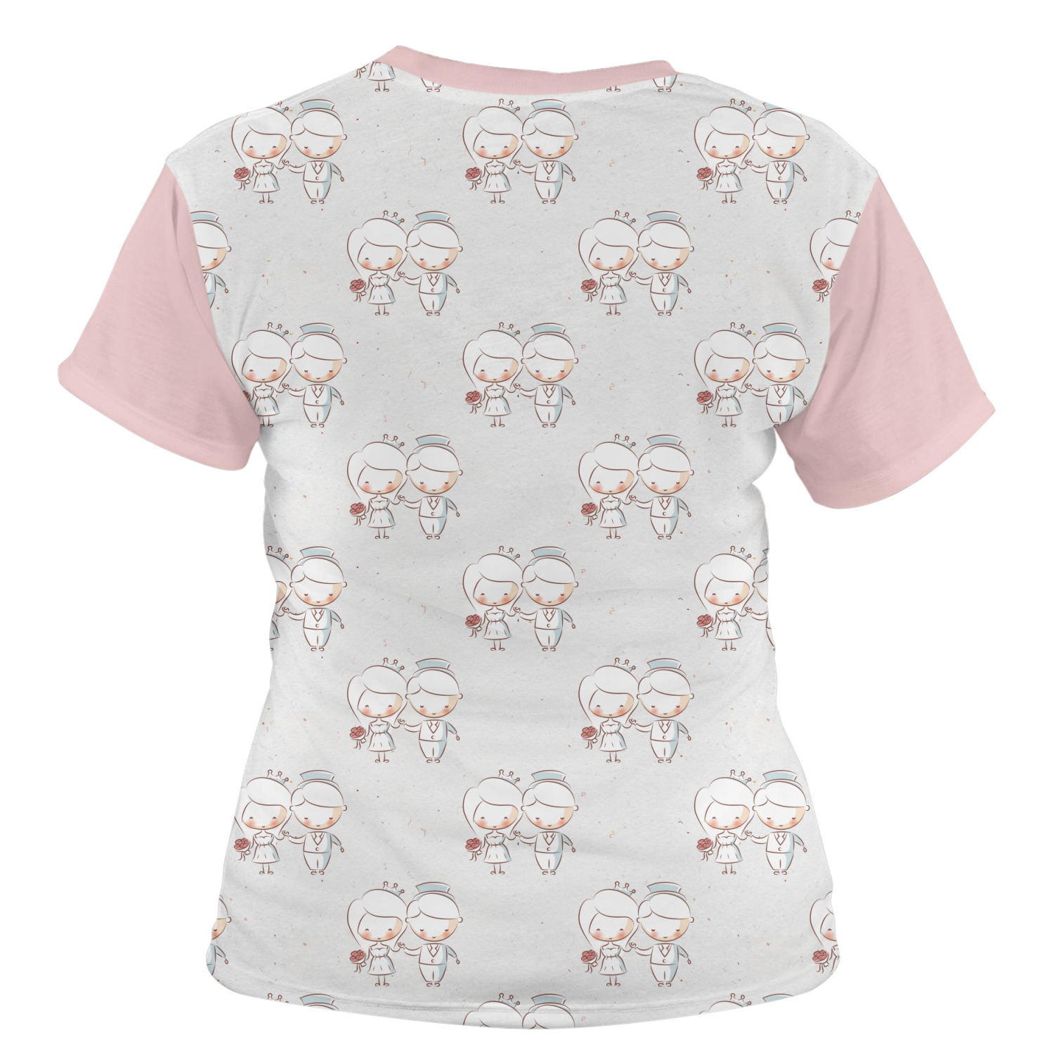 This design has an adorable bride and groom at the center of attention. They sit holding hands on a speckle textured off-white background. Above and below them is where the personalization goes, with the bride and groom's names and wedding date or whatever you choose. The textured background is a circle that surrounds the bride and groom while another background sits behind this circle. The secondary background is a white and light pink heart damask pattern, which looks adorable with the couples and their sweet rosy cheeks.