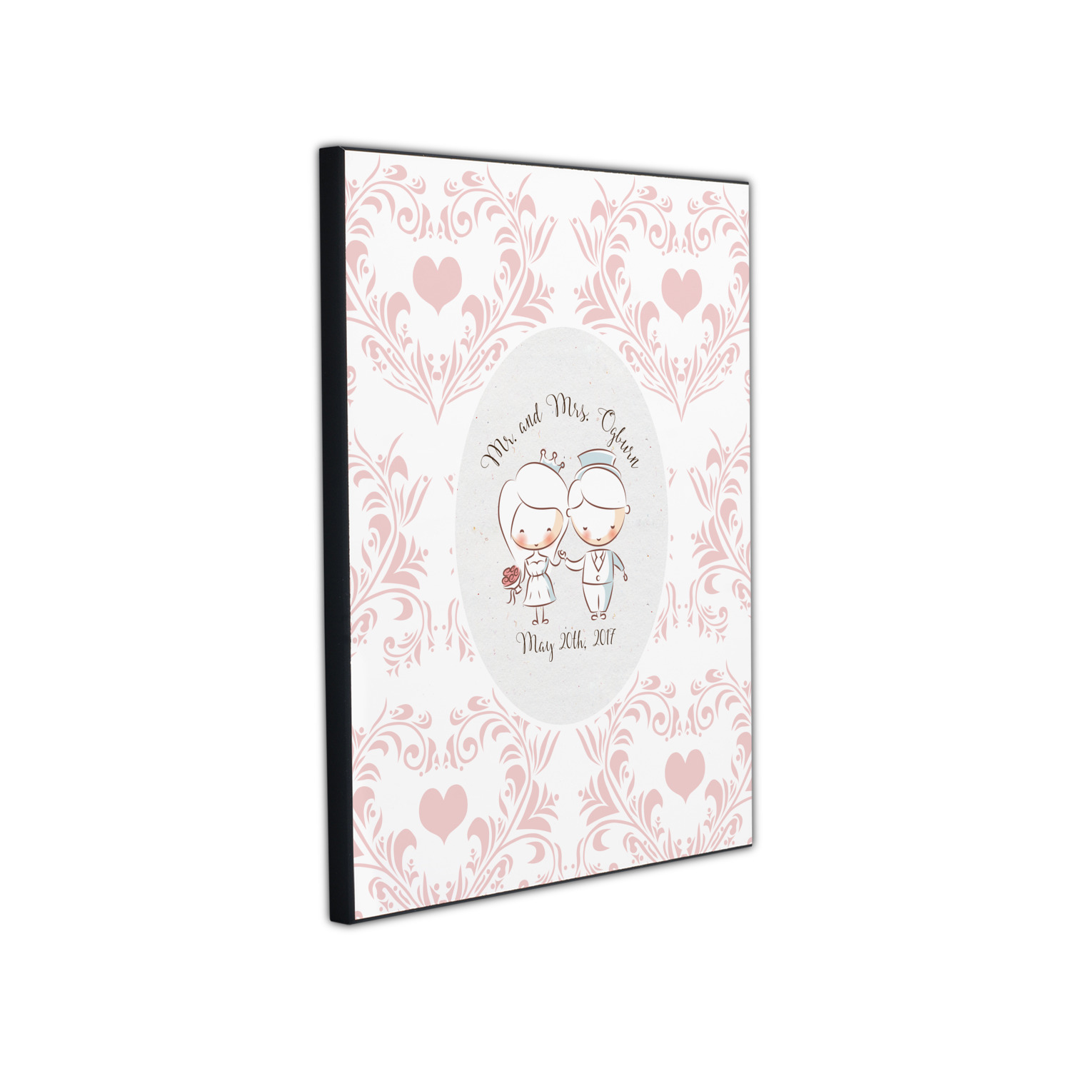 This design has an adorable bride and groom at the center of attention. They sit holding hands on a speckle textured off-white background. Above and below them is where the personalization goes, with the bride and groom's names and wedding date or whatever you choose. The textured background is a circle that surrounds the bride and groom while another background sits behind this circle. The secondary background is a white and light pink heart damask pattern, which looks adorable with the couples and their sweet rosy cheeks.