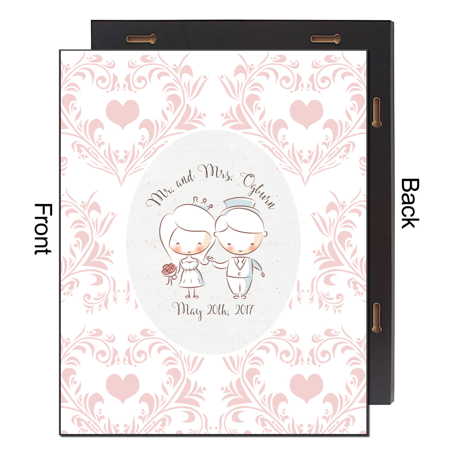 This design has an adorable bride and groom at the center of attention. They sit holding hands on a speckle textured off-white background. Above and below them is where the personalization goes, with the bride and groom's names and wedding date or whatever you choose. The textured background is a circle that surrounds the bride and groom while another background sits behind this circle. The secondary background is a white and light pink heart damask pattern, which looks adorable with the couples and their sweet rosy cheeks.