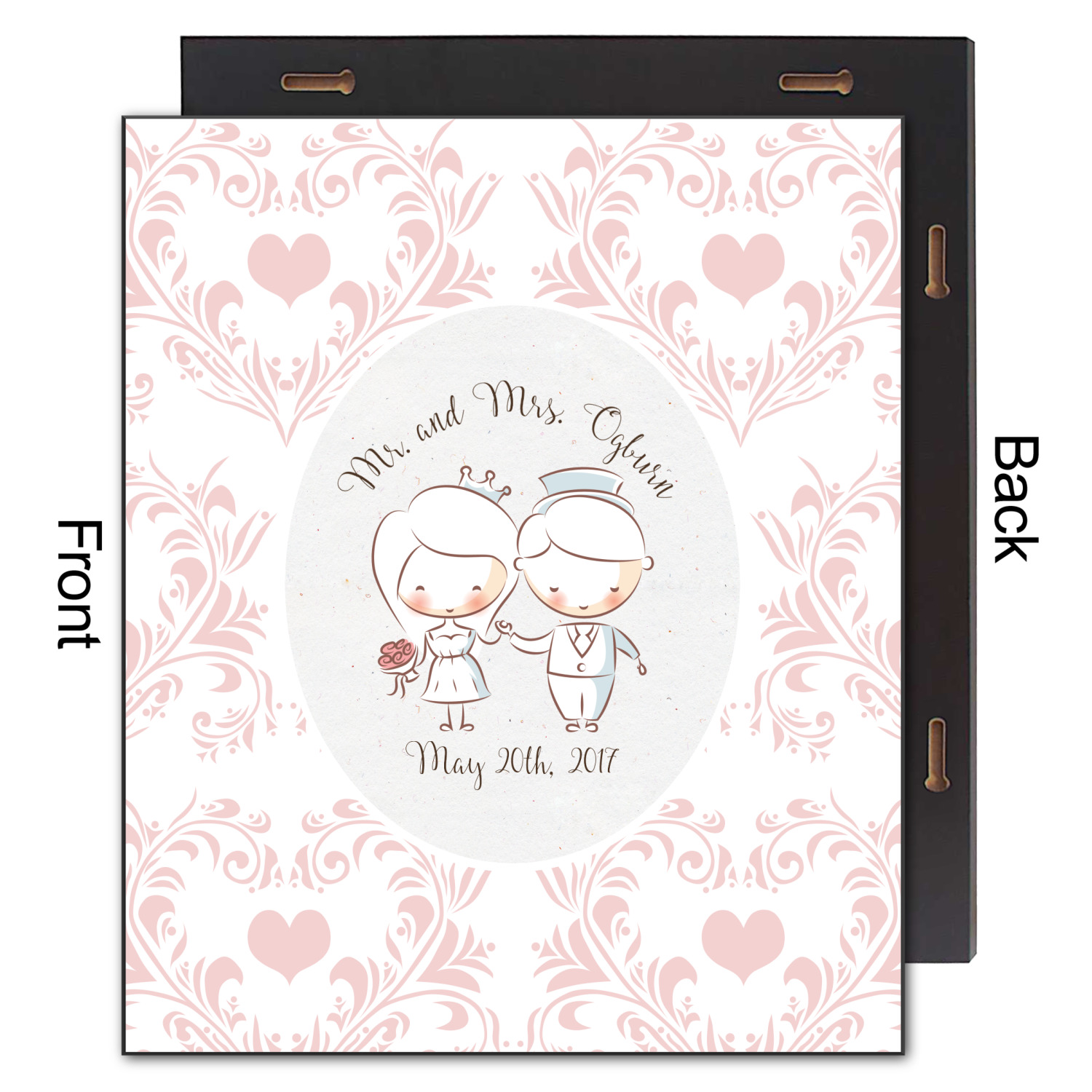 This design has an adorable bride and groom at the center of attention. They sit holding hands on a speckle textured off-white background. Above and below them is where the personalization goes, with the bride and groom's names and wedding date or whatever you choose. The textured background is a circle that surrounds the bride and groom while another background sits behind this circle. The secondary background is a white and light pink heart damask pattern, which looks adorable with the couples and their sweet rosy cheeks.