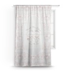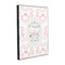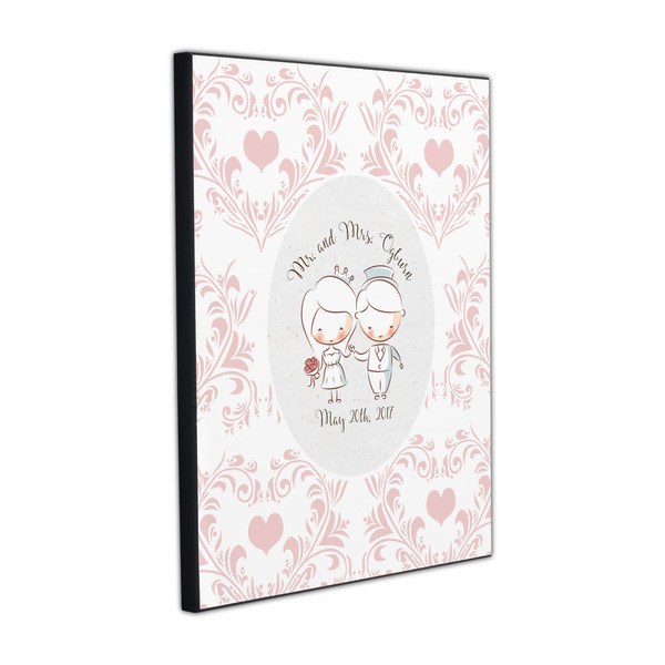 This design has an adorable bride and groom at the center of attention. They sit holding hands on a speckle textured off-white background. Above and below them is where the personalization goes, with the bride and groom's names and wedding date or whatever you choose. The textured background is a circle that surrounds the bride and groom while another background sits behind this circle. The secondary background is a white and light pink heart damask pattern, which looks adorable with the couples and their sweet rosy cheeks.