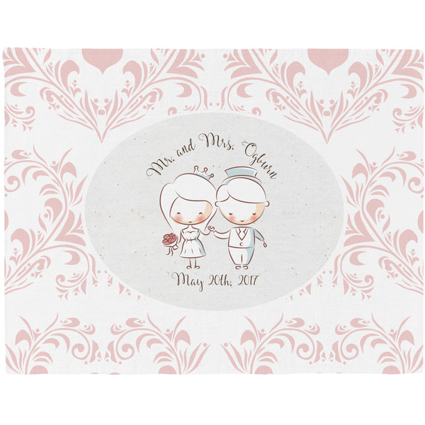 This design has an adorable bride and groom at the center of attention. They sit holding hands on a speckle textured off-white background. Above and below them is where the personalization goes, with the bride and groom's names and wedding date or whatever you choose. The textured background is a circle that surrounds the bride and groom while another background sits behind this circle. The secondary background is a white and light pink heart damask pattern, which looks adorable with the couples and their sweet rosy cheeks.