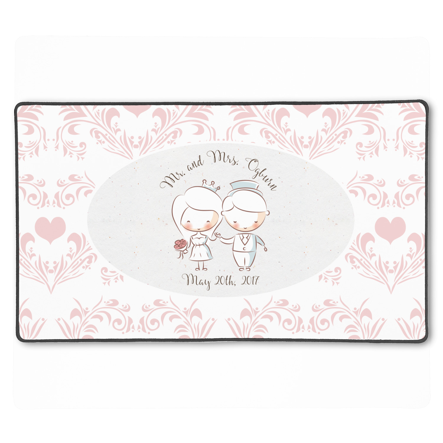 This design has an adorable bride and groom at the center of attention. They sit holding hands on a speckle textured off-white background. Above and below them is where the personalization goes, with the bride and groom's names and wedding date or whatever you choose. The textured background is a circle that surrounds the bride and groom while another background sits behind this circle. The secondary background is a white and light pink heart damask pattern, which looks adorable with the couples and their sweet rosy cheeks.